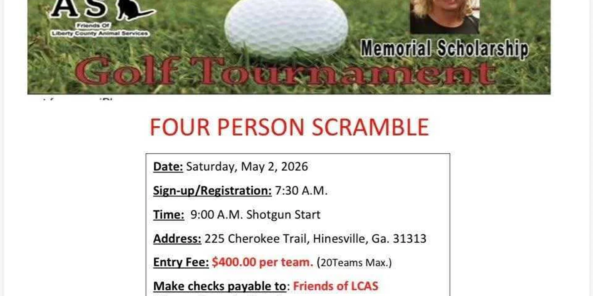 Please join the Friends of Liberty County Animal Services for their Fore the Paws Golf Tournament! Sign-up/Registration: 7:30am Shotgun Start Time: 9:00am See flyer for more details.