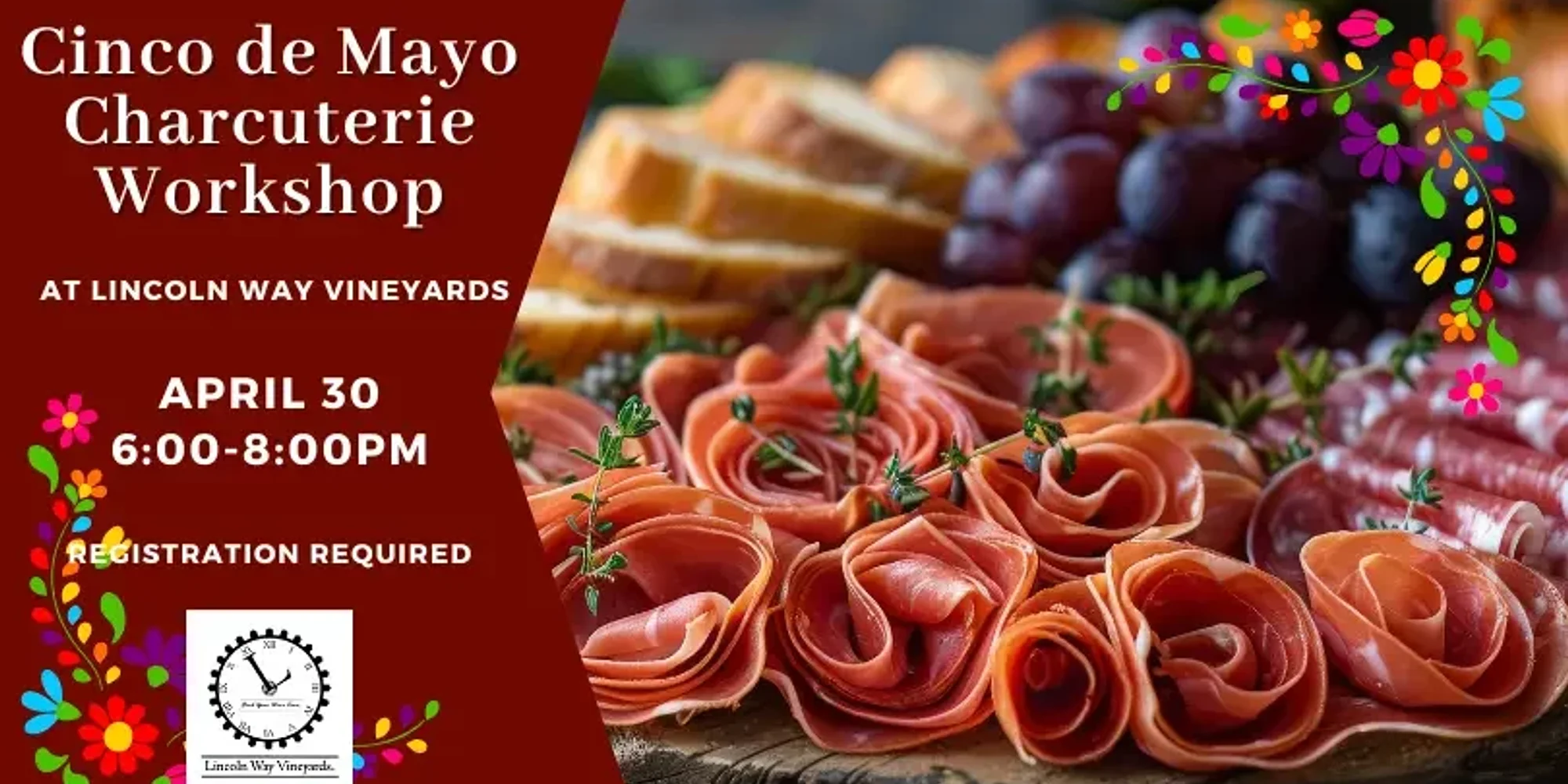 Join us for a fun, hands-on Cinco de Mayo themed charcuterie workshop where you’ll learn to create a stunning board that feeds 2-4 people! All premium supplies—including cured meats, artisanal cheeses, fresh fruits, nuts, crackers, spreads, and garnishes,—are provided. Watch a live demo and get step-by-step guidance on crafting charcuterie roses, elegant fruit cutting and impressive food styling techniques to balance flavors, textures, and colors for a show-stopping presentation. You will leave this workshop with your beautiful, fully assembled board, new skills, and the confidence to wow at your next gathering—perfect for sharing, date nights, or gifting! Cost: $60/person included all the supplies to make your charcuterie board PLUS your first glass of wine Tickets go on sale April 3. All ticket sales for Lincoln Way Vineyards events are final and nonrefundable. In the event of unforeseen circumstances, tickets may be transferable to another person. Please contact us in advance to make arrangements. Lincoln Way Vineyards reserves the right to modify or reschedule events as necessary. By purchasing a ticket, you agree to these terms.