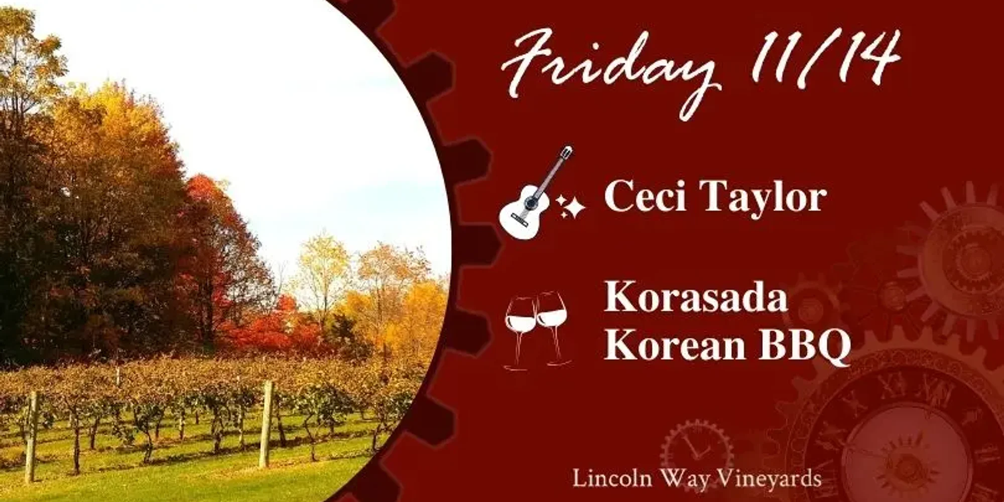 Spice up your Friday night with bold flavors and smooth live music at Lincoln Way Vineyards! Ceci Taylor brings her signature blend of soulful vocals, pop, and acoustic charm for a laid-back performance that pairs perfectly with a glass of wine and vineyard views. Korasada Korean BBQ is serving up their fan-favorite fusion of Korean and Latin street food—think Korean BBQ tacos, rice bowls, and crave-worthy sides packed with flavor. Your perfect Friday starts at Lincoln Way Vineyards! _______________________ Food starts at 5pm** Music starts at 6pm **Food Truck times are subject to change. Feel free to ask us or check-in with the food truck.**
