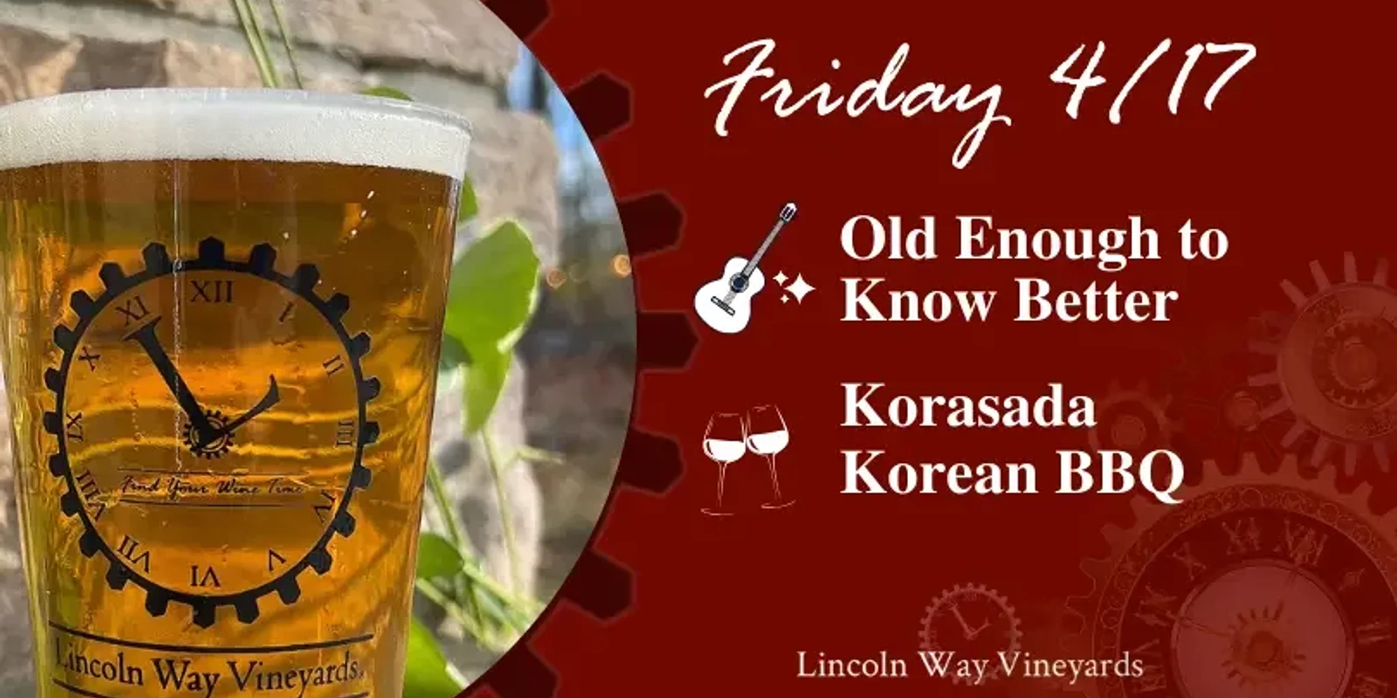 Add a little spice to your Friday plans at Lincoln Way Vineyards with Food Truck Friday on April 17! Join us for an evening that blends bold flavors, live music, and a fun, laid-back vineyard atmosphere. Korasada Korean BBQ will be serving up their crave-worthy Korean BBQ favorites, bringing big flavor to the vineyard, while Old Enough to Know Better takes the stage with live music to keep the night moving. Come hungry, grab your favorite wine, cider, or craft beer, and settle in for a Friday night done right. Whether you’re meeting friends, planning a casual date night, or just ready to kick off the weekend, Lincoln Way Vineyards is the place to be. _______________________ Food starts at 5pm** Music starts at 6pm **Food Truck times are subject to change. Feel free to ask us or check-in with the food truck.**