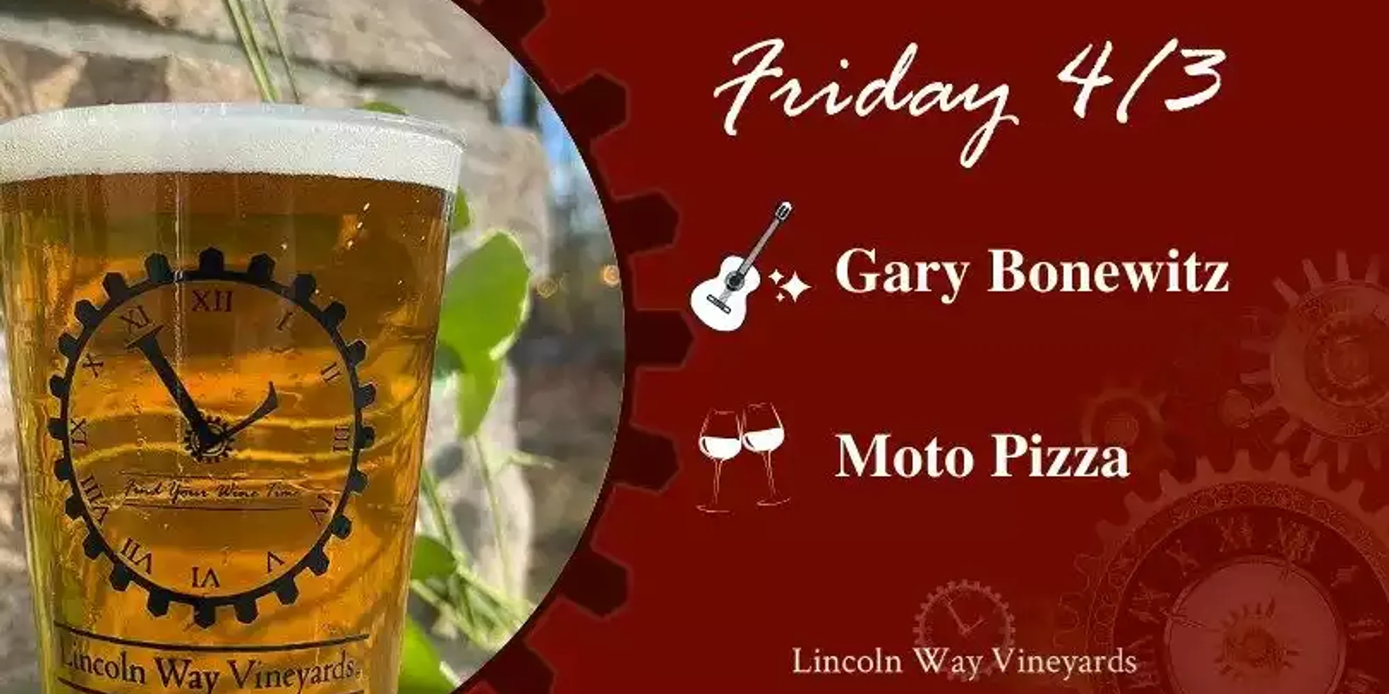 Join us for Food Truck Friday at Lincoln Way Vineyards on Friday, April 3, and kick off your holiday weekend with great food, live music, and time together. Since it’s Good Friday, it’s the perfect evening to slow down, relax, and gather with family and friends. Moto Pizza will be serving up their fan-favorite pies starting at 5:00 PM, and Gary Bonewitz will take the stage with live music beginning at 6:00 PM. Grab a glass of wine, cider, or beer, find a seat, and enjoy an easygoing night in the vineyard. Have family in town for the holiday weekend? Bring them along! There’s no better way to welcome visitors than sharing good food, great music, and a laid-back atmosphere at the winery. No tickets required—just come out, Find Your Wine Time®, and enjoy the evening with us. _______________________ Food starts at 5pm** Music starts at 6pm **Food Truck times are subject to change. Feel free to ask us or check-in with the food truck.**
