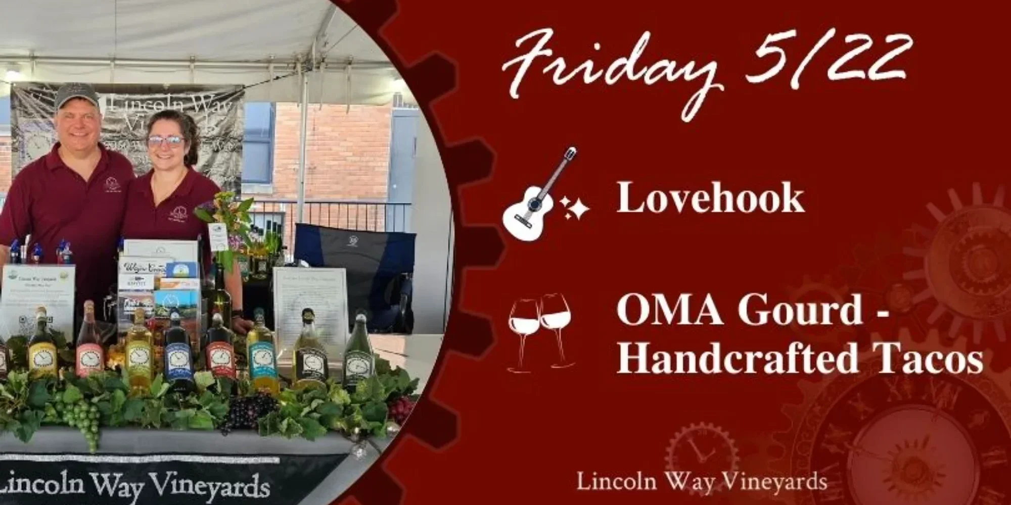 Kick off the Memorial Day holiday weekend at Lincoln Way Vineyards with Food Truck Friday, featuring OMA Gourd Handcrafted Tacos and live music from LoveHook. Start the long weekend right with creative, made-from-scratch tacos from OMA Gourd, a glass of your favorite wine, cider, or beer, and live music that sets the tone for a fun, relaxed night. With LoveHook bringing the energy, it’s the perfect way to slide into a weekend all about slowing down and spending time with the people you love. Whether you’re staying local or welcoming guests into town, this is your sign to spend the holiday weekend Finding Your Wine Time at the vineyard. _______________________ Food starts at 5pm** Music starts at 6pm **Food Truck times are subject to change. Feel free to ask us or check-in with the food truck.**