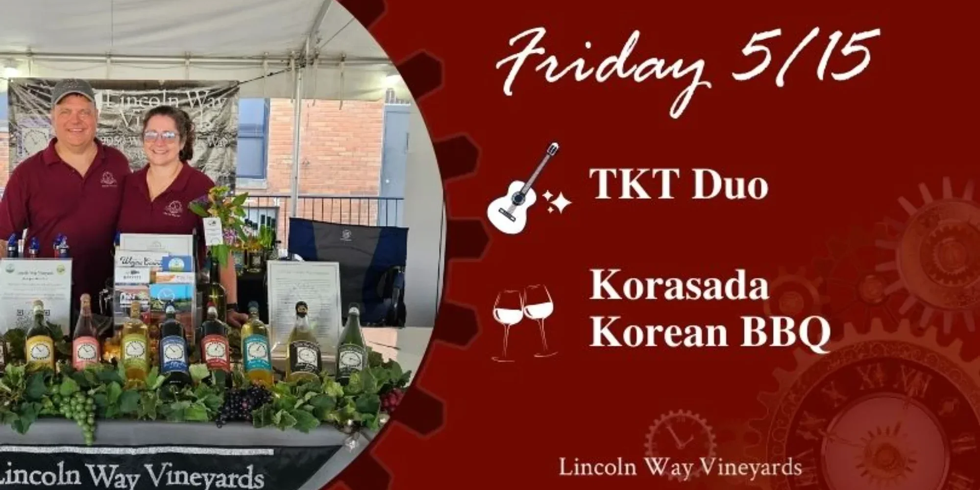 Kick off your weekend at Lincoln Way Vineyards with Food Truck Friday, featuring live music from TKT Duo and bold bites from Korasada Korean BBQ. Come hungry for Korasada’s flavor-packed Korean BBQ favorites, then settle in with a glass of wine, cider, or craft beer as TKT Duo sets the tone with live music that’s perfect for a relaxed Friday night. It’s an easygoing evening made for unwinding, catching up, and enjoying the vineyard atmosphere. Bring your friends, make it a casual date night, or just stop by to enjoy the vibe—no tickets required. _______________________ Food starts at 5pm** Music starts at 6pm **Food Truck times are subject to change. Feel free to ask us or check-in with the food truck.**