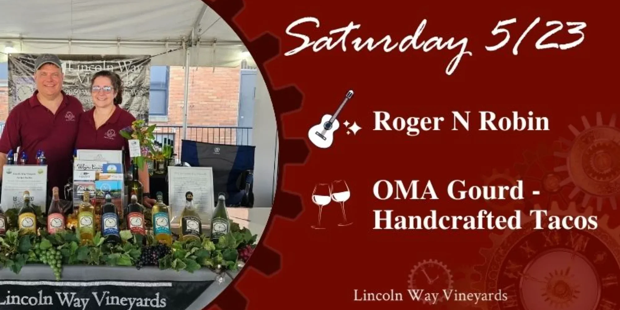Keep the holiday weekend rolling at Lincoln Way Vineyards with our Saturday Tunes & Food, because one good night deserves another. Spend your evening enjoying handcrafted tacos from OMA Gourd paired with live music from Roger N Robin. Music will be outdoors, weather permitting. It will be the kind of night made for lingering conversations, easy laughs, and savoring the unofficial start of summer with a glass of wine, cider, or craft beer in hand. Whether you’re hosting out-of-town guests or staying close to home, this is the perfect way to slow down and soak in the long weekend. Come hungry, come thirsty, and spend your holiday weekend with us. _______________________ Food starts at 5pm** Music starts at 6pm **Food Truck times are subject to change. Feel free to ask us or check-in with the food truck.**