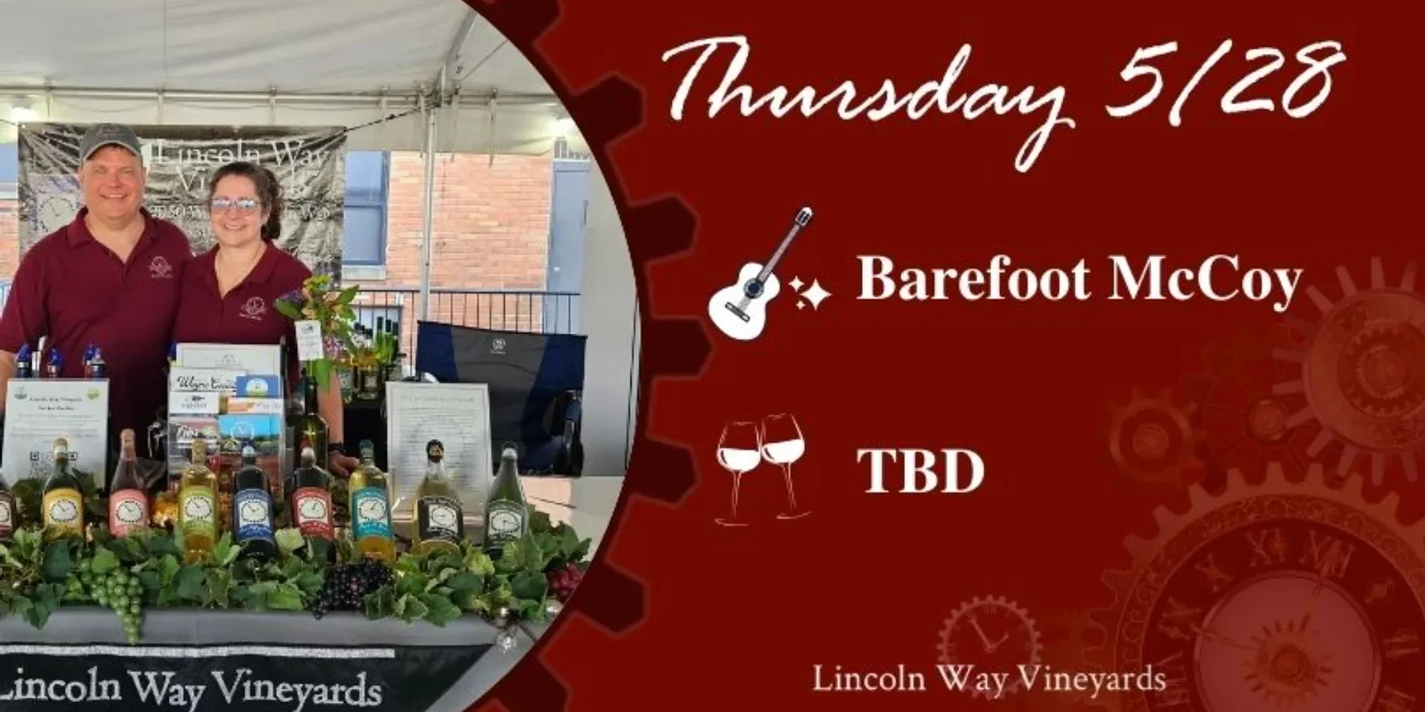 Kick off the unofficial summer season at Lincoln Way Vineyards with our very first Thursday Night Escape of 2026 on May 28! It’s the perfect way to shake off the week with live music, delicious eats, and vineyard vibes. Our live music will be from Barefoot McCoy – A talented folk-rock singer-songwriter whose soulful lyrics and infectious melodies create the perfect soundtrack for a relaxed evening. Blending heartfelt storytelling with rich acoustic sounds, his performances invite you to sit back, tap your feet, and get lost in the music. Whether you’re a longtime fan or hearing him for the first time, Barefoot McCoy brings a warm, authentic energy that makes every show feel personal and unforgettable. Food truck details coming soon. _______________________ Food starts at 5pm** Music starts at 6pm **Food Truck times are subject to change. Feel free to ask us or check-in with the food truck.**