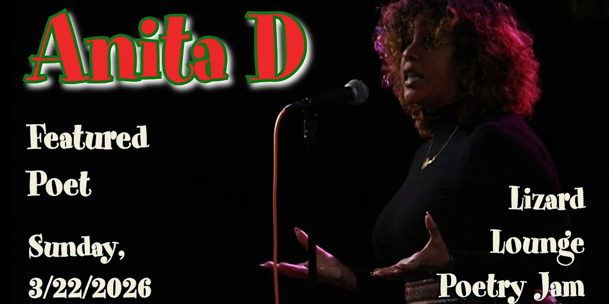 The Lizard Lounge Poetry Jam with featured poet Anita D March 22nd! $10 Anita D is a mother, a daughter, a caretaker, a coach, a creative, a spoken word artist, and a nationally recognized slam poet. Born & raised in Brockton, Ma, Anita has always had a fighting spirit. While she has been writing since the age of 15, it wasn’t until almost 10 years later that she found solace to grow in poetry in San Diego. At 25, she began slamming in Southern California and has since slammed both as an individual and a team member for the San Diego and Boston (House) slam teams. Her most notable accomplishments in slam have been placing 2nd in the 2016 National Poetry Slam and 3rd at the 2019 Individual World Poetry Slam. She has featured at various venues and universities across the nation, even including a performance at the Staples Center. Anita’s work consists of a personal narrative covering various topics from generational healing to mental health awareness. Her poems can be found on Button Poetry, All Def Poetry & Slamfind for now, but one day, in the near future, she will be dropping her first book published by Button Poetry. Lizard Lounge Poetry Jam