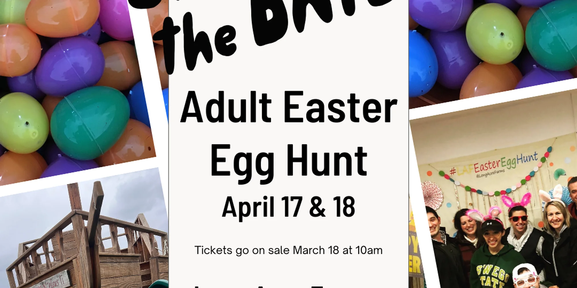Why let the kids have ALL the fun?! This event is for grown ups ONLY – ages 21 & up. That’s right, you must be of legal drinking age to attend this event. Here’s how it works! 1. Purchase your ticket. Tickets on Sale Starting March 18th at 10am. $45pp 2. Tickets are limited, so don't forget to get a few for your friends too!!! 3. Arrive at Long Acre Farms around 6PM. Wood-fired pizzas will be available for purchase and cash bar. Water & lemonade provided. The Winery Tasting Room will be open, too!! 4. Participate in 'old school' games. ie: egg toss, relay races to win free drinks!! 5. At 8PM the egg hunt will commence – in the spirit of the season, the number of eggs retrieved per person will be limited. Your honesty and good sportsmanship is appreciated. 6. YES, this event will take place OUTSIDE – it might be raining, it might be snowing, it will be DARK, so be prepared!!! Dress for the weather and don't forget a flashlight! Come early & let us handle dinner for you....we will have wood-fired pizzas available for purchase and a cash bar! Tickets are non-refundable or transferrable to different dates. Double check your date before purchasing your ticket! Ticket includes entrance into the hunt, prizes (a large range of prizes depending on the eggs you find!) large prize raffle ticket, yard games, fun old-school egg games, light snacks and non-alcoholic beverages. Weather permitting, we will have fires going outside to enjoy! Cash Bar and wood-fired pizzas available for purchase. Tickets go on sale March 18th at 10am Tickets!
