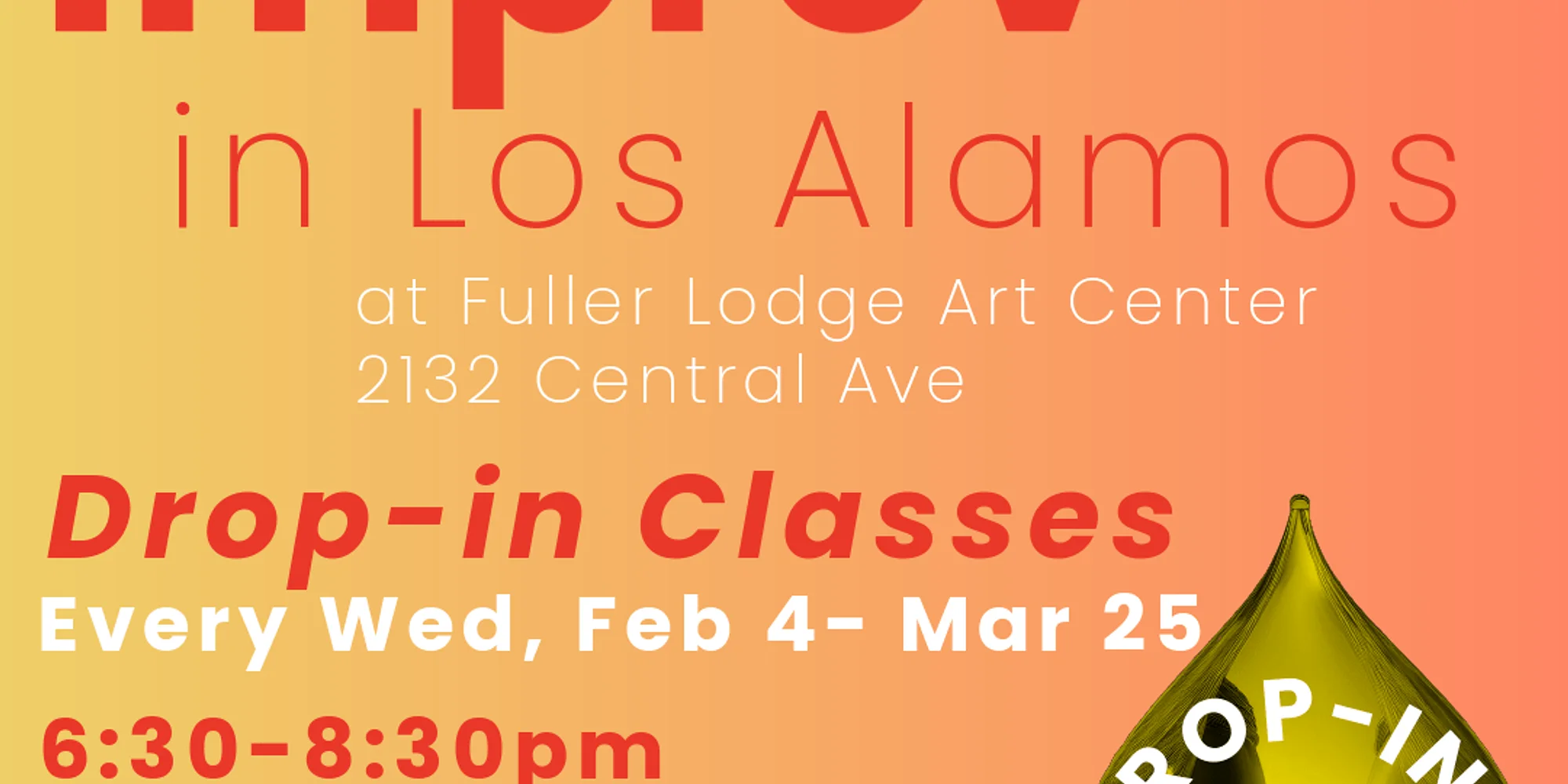 Wednesdays, February 4 – March 25 Class Time: 6:30-8:30 pm 8 sessions– come to one or all or anywhere in between! Instructor: Nick Hubley Location: Fuller Lodge Art Center, 2132 Central Ave, Los Alamos, NM Presented by Santa Fe Improv and Los Alamos Little Theatre. This event is not affiliated with the Los Alamos Arts Council. Everyone is welcome to these all-level drop-in sessions! No prior improv experience necessary. Adults only. According to their website, the presenters are unable to provide refunds for drop-in classes. Link to sign up here!