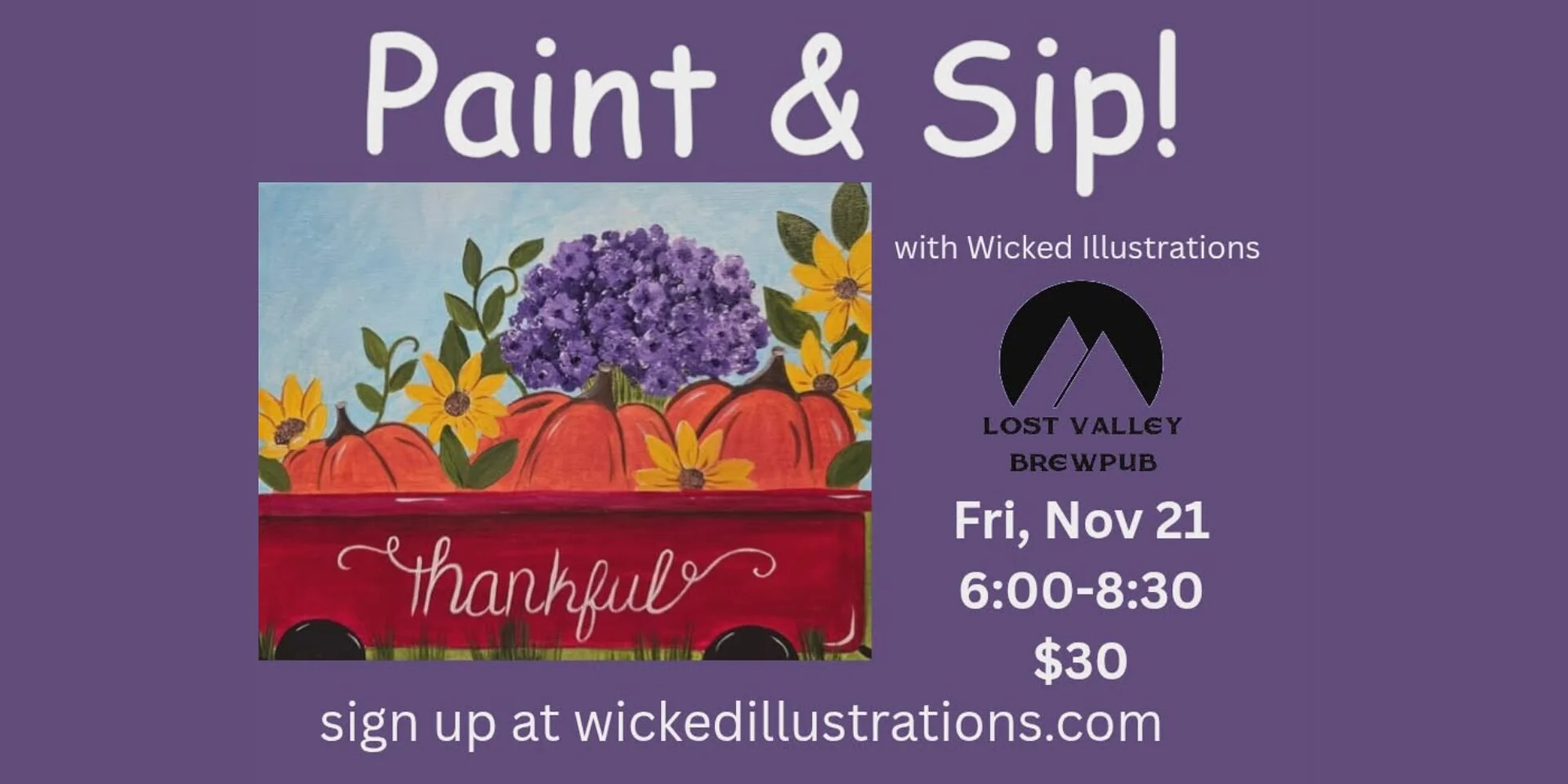 We are so excited for our yearly Harvest themed Paint and Sip on Friday, November 21st 6pm-8:30pm! Lost Valley’s Brewpub opens at 4pm for food, drinks and fun. Get to Lost Valley early and have dinner by the fireplace and enjoy a beverage from their full bar. Then get ready to get your paint on with Melanie Therrien from Wicked Illustrations. She will walk you through step by step to create your own version of our bountiful red wagon. Change your colors, add different flowers or go totally rouge. Our system allows for only one sign up at a time, if you have a large group email wickedillustrations@gmail.com for an invoice. only $30 pp sign up at https://wickedillustrations.com/art-parties-and-workshops and check out our other parties and classes while you are there!