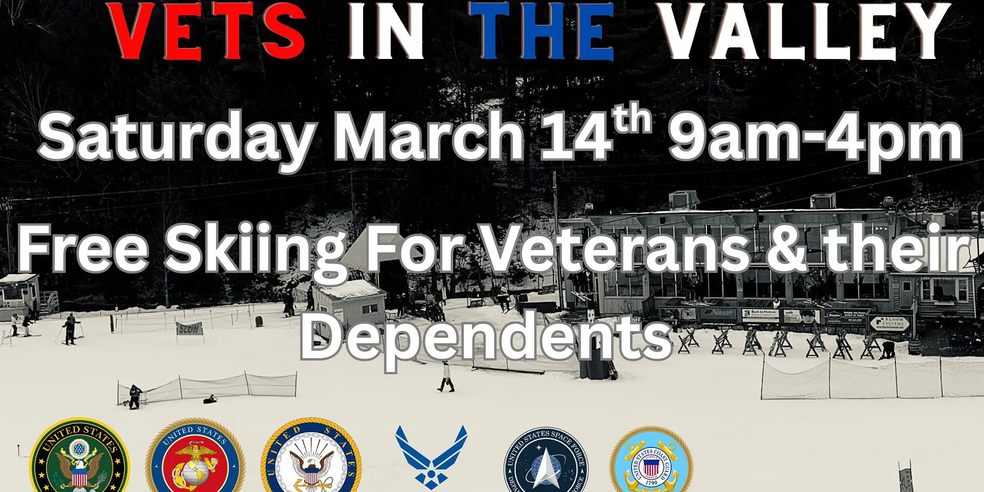 Our way of saying THANK YOU to all of our Military Veterans, Active Duty, and Reserve Guard Members All military veterans, active duty & reserve guard members & their family members (dependents) ski & snowboard free! All military veterans, regardless of the length of service, receive a free lift ticket that day for themselves and immediate family (dependents). Must show proof of service at time of purchase at the ticket window. Ski & Snowboard rental equipment is available for purchase at a special discounted Military rate of $39 (reg $55) for all veterans and their dependents. Highly recommended to Reserve gear in advance online at https://shop.lostvalleyski.com/rentals Vets in the Valley 2026 Saturday, March 14 Ski/Snowboard: 9am – 4pm (0900-1600) Veterans Orgs on Site 10am-2pm (1000-1400) Complimentary Appetizer Buffet at 2pm (1400) while supplies last Live Music in Pub: 1pm – 4pm (1300-1600) Our way of saying thank you for your service. Enjoy a day of outdoor fun with your family Meet and greet with Veterans Agencies scattered around the lodge and base area