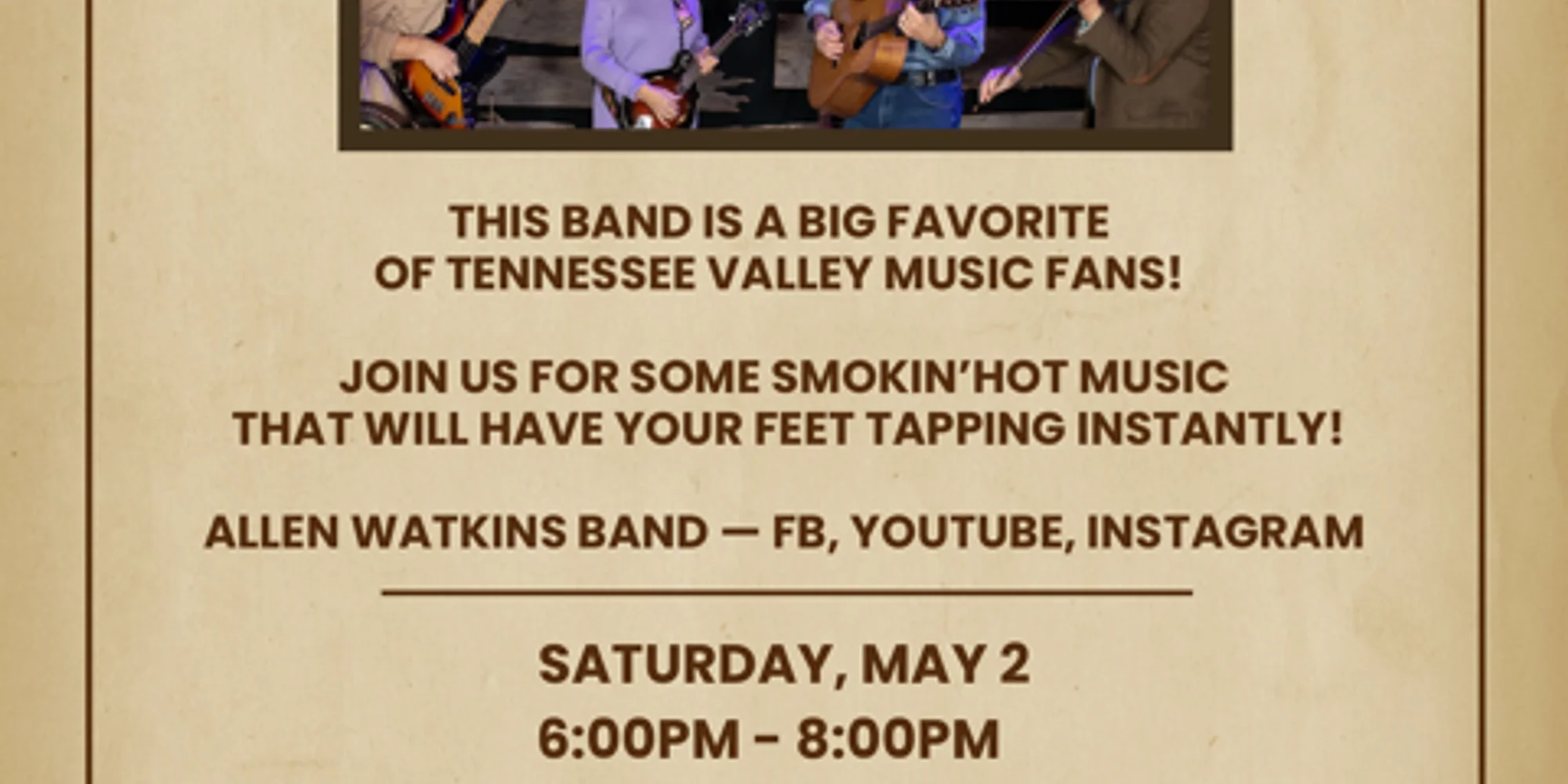 The Allen Watkins Band is a big favorite of Tennessee Valley music fans. Join The HUntsville Traditional Music Association for some smokin’ hot music that will have your feet tapping in no time at all! The band plays original acoustic music and Americana-style covers. At the show, you’ll hear some brand new original music that will be featured on an album scheduled for a Summer release. Allen Watkins, Connie Watkins, Joe Parker, and Garrett Smith will play some fine, Alabama-flavored guitar, banjo, mandolin, bass, and violin tunes. This is a FREE event.