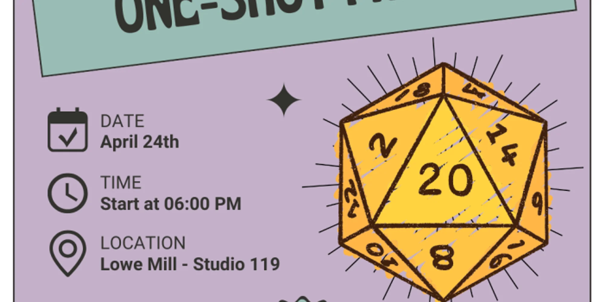 Join Nerdzilly for a one-shot! Games are Friday from 6:00pm-10:00pm. One-shots are either 5th or 5.5 edition, beginner friendly, and come with pre-generated characters, digital maps, tokens, and more! You are welcome to bring in food/drink as well. Please park by door 21 or 17! Session may end before 10pm.