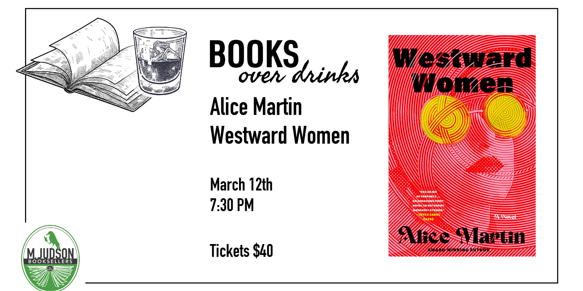 For fans of Emma Cline and Emily St. John Mandel, Westward Women is a hypnotic and hopeful debut—part fever dream, part dystopian road trip. If you love Jeff VanderMeer and Alice McDermott, you do not want to miss Books Over Drinks with Alice Martin! REVIEWS: “An audacious first novel to set beside Margaret Atwood’s provocative first novel The Edible Woman.” – Joyce Carol Oates, award-winning author “A chilling, unforgettable, and ultimately hopeful story that will get under your skin and stay there.” – Gina Chung, author of Sea Change and Green Frog “A wholly original look at what it means to be female, itching with fear and promise and the desire to find your true self in the face of constant interference.” – Rachel Moulton, author of The Insatiable Volt Sisters and Tinfoil Butterfly ABOUT THE AUTHOR: Alice Martin holds a PhD in Literature from Rutgers University. She is an Assistant Professor of English Studies at Western Carolina University, where she teaches fiction writing and American literature. She lives outside of Asheville, North Carolina with her husband, her son, and too many typewriters. Westward Women is her debut novel. Never been to Books Over Drinks? Your ticket includes entry to the event, a signed copy of the book, and a signature cocktail or mocktail.