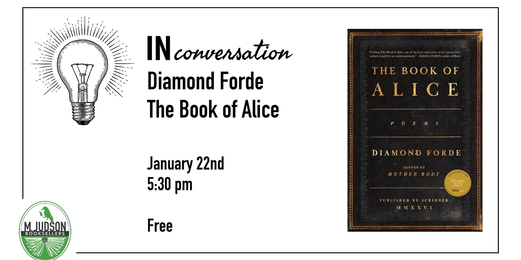From the award-winning author of Mother Body comes a stunningly powerful poetry collection exploring lineage and the legacy of survival as seen through the life of her grandmother Alice–a Black woman born in the Jim Crow South–using the King James Bible as a narrative framework. Join us for a free event with poet Diamond Forde in conversation with Glenis Redmond! REVIEWS: “Calling The Book of Alice one of the best collections of the twenty-first century would be an understatement. I do not know that I have ever read a better book about grandmothers in my readerly life. Diamond Forde handles frequencies, pauses, and traditions like a conjurer of the highest rank. I’m most taken by the sound of the book. This is as ecstatic as literature gets.” —Kiese Laymon, author of Heavy “Diamond Forde’s newest poetry collection is as much a restoration as it is a reimagining, a return of Black women to our rightful place as the center of the world and of the Word. These brilliant, breathtaking poems, brimming with intimacies and interrogations, are at once familial and universal. The Book of Alice’s cup runneth over with quiet devastations and resistances, across generations and time. This is a book I’ll keep close to my heart.” —Deesha Philyaw, author of The Secret Lives of Church Ladies “Diamond Forde’s The Book of Alice climbs back through the branches of the family tree, calling down ancestral voices to sing inside poems inspired by Biblical tradition, recipes, a census report, and other formal containers. Forde unfurls family secrets and truths across her pages, dancing past the barriers of bloodline-memory to discover what sweetness or sharpness lives on the other side. Most delightfully, Forde’s dynamic language gallops through this book, irresistible to read out loud: ‘batter / buttered, harpooned with jam….& I crop top, too. Coquette / my blubber, my bust.’ The Book of Alice invites the reader into a kind of wonderful veneration—of the body, of the family, and of the holy self.” —Maria Zoccola, author of Helen of Troy, 1993 ABOUT THE AUTHOR: Diamond Forde’s debut collection, Mother Body, was chosen by Patricia Smith as the winner of the 2019 Saturnalia Poetry Prize. She has been the recipient of the Pink Poetry Prize, the Furious Flower Poetry Prize, and CLA’s Margaret Walker Memorial Prize, and other honors. She is a Callaloo, Tin House, and Ruth Lilly and Dorothy Sargent Rosenberg fellow whose work has appeared in Boston Review, Massachusetts Review, Ninth Letter, and elsewhere, and she serves as the interviews editor for Honey Literary. Diamond holds an MFA from The University of Alabama and a PhD in creative writing with concentrations in African American poetics and fat studies from Florida State University. She is an assistant professor at North Carolina State University. ABOUT THE CONVERSATION PARTNER: Glenis Redmond is a poet, performer, and teaching artist with a three-decade career dedicated to poetry and community engagement. She is...