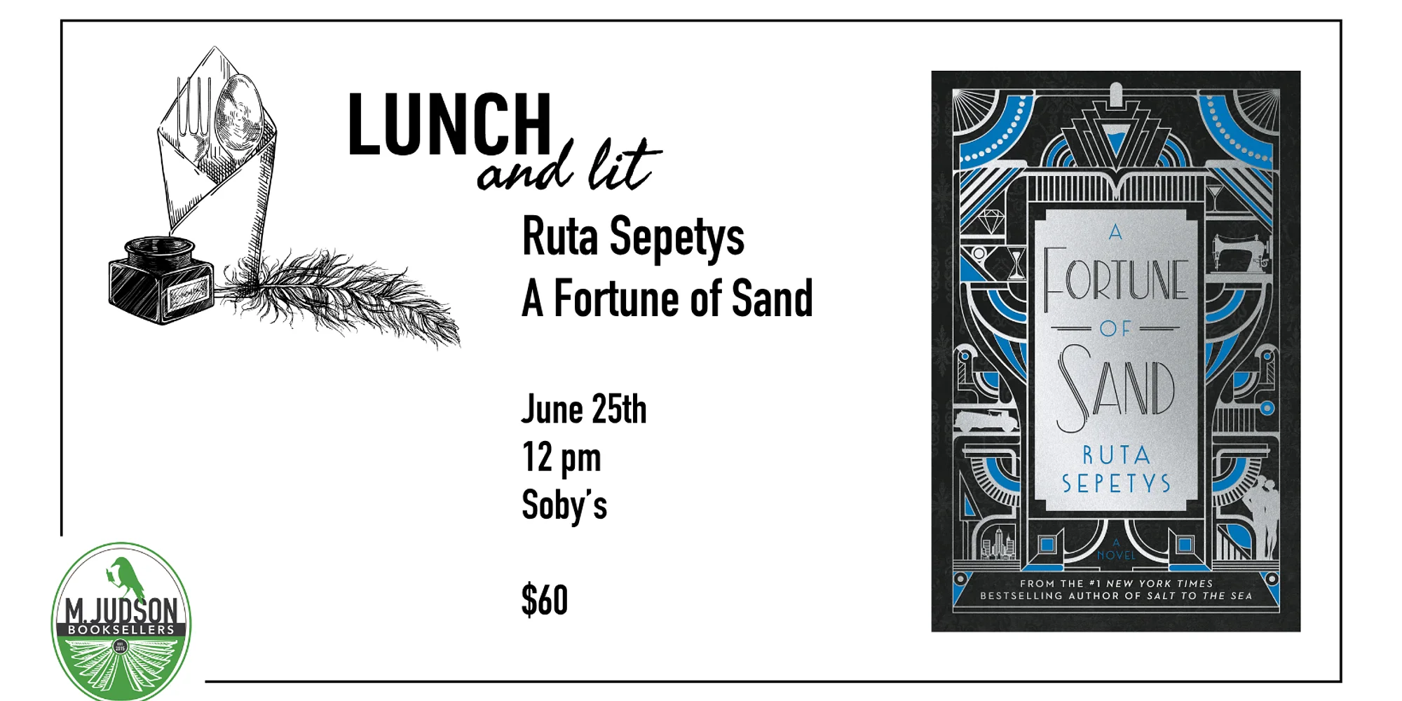 The daughter of an automotive magnate escapes to an artistic retreat that holds more secrets—and more intrigue—than she could have ever imagined, in this Prohibition-era novel from the #1 New York Times bestselling author of Salt to the Sea. If you love Fiona Davis and Marie Benedict, you do not want to miss Lunch & Lit with Ruta Sepetys for A Fortune of Sand! REVIEWS: “Ruta Sepetys is a literary citizen of the highest order, a true friend to readers, writers, and booksellers. Her books are moving, fascinating, and meticulously researched. She makes history live in order that we may learn from it.”—Ann Patchett, #1 New York Times bestselling author of Tom Lake “Sepetys beautifully captures the madcap days of Prohibition in the Detroit suburbs, centered around the wealthy Lennox clan. Underneath the gilt, however, cracks abound, inspired by real-life events of the time and uncovered through Sepetys’s impeccable research. A heady exploration of women’s agency, as well as a killer romance and a beguiling mystery. Wildly entertaining.”—Fiona Davis, New York Times bestselling author of The Stolen Queen “Enthralling . . . While history is often molded by those in power, there are always those who can wrest control and write a new story of their own. A Fortune of Sand should be required reading.”—Marie Benedict, New York Times bestselling co-author of The Personal Librarian and The First Ladies “I’ve been waiting for this day for years . . . at long last, Ruta Sepetys has given us an adult novel! Set in Prohibition-era Detroit, A Fortune of Sand is inspired by the documented lives of the nouveau riche automotive dynasties and the undocumented stories of the infamous Eloise Asylum. As a seasoned historical novelist, Sepetys knows gold when she finds it, and this book sparkles! For readers seeking the glamour of The Great Gatsby with the mystery of an Agatha Christie novel, A Fortune of Sand is for you.”—Sarah McCoy, New York Times bestselling author of Whatever Happened to Lori Lovely? ABOUT THE AUTHOR: Ruta Sepetys is an internationally acclaimed, #1 New York Times bestselling author of historical fiction published in over sixty countries and forty languages. Winner of the Carnegie Medal and honored by the American Academy of Arts and Letters, Ruta gives voice to underrepresented history and those who experienced it. She has been invited to present at NATO, European Parliament, the U.S. Capitol, the Library of Congress, and embassies worldwide. Ruta alternates her time between the hills of Tennessee and the flats of Florida. Never been to Lunch & Lit? Your ticket includes entry to the event, a three course meal from Soby’s, and a signed copy of the featured book.
