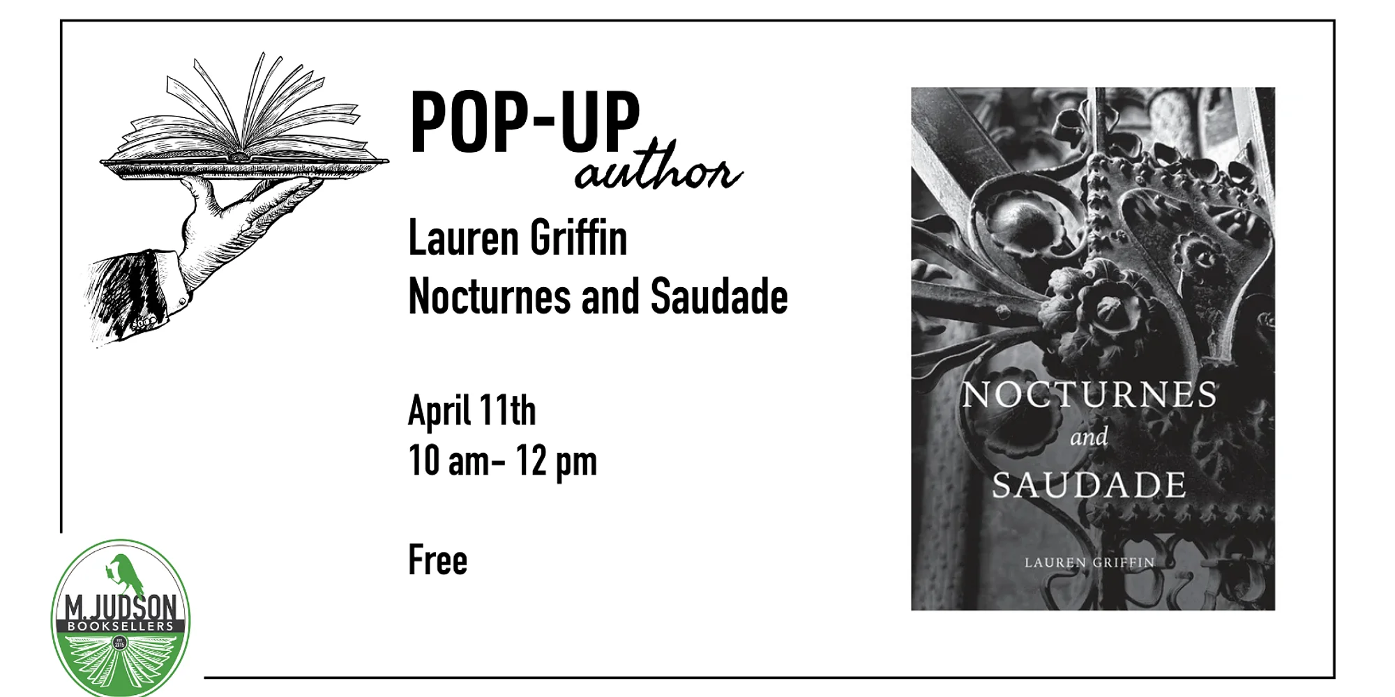 Stop by M. Judson Booksellers for a free Saturday morning pop up with local poet Lauren Griffin for her new collection, Nocturnes and Saudade! ABOUT THE BOOK: An honest, empathetic collection filled with passion, Nocturnes and Saudade will reassure you that pain is often a companion to love and that you are not alone, no matter what you’re feeling. By “offering a vocabulary for wounds” and “creating story out of brokenness,” Griffin reworks the lessons of her personal narrative, exemplifying how the storms of our hearts—when brought to light through poetry—can provide both understanding and healing to ourselves and others. Whether grief is an old friend of yours or you are meeting it for the first time, you can always be sure to find peace in the in-between, in the world of dreams. ABOUT THE AUTHOR: Lauren Griffin lives in Greenville, South Carolina, where she works as a nurse practitioner in pediatrics. She received her BA in Spanish from Furman University and her post-master’s degree as a nurse practitioner from Vanderbilt University. What began as personal endeavors to pen her most vulnerable experiences grew into her first chapbook. Poetry has been a rich source of comfort for her in seasons of sorrow and confusion and has inspired her to delve into the deep complexities of grief, loss, and the search for hope in her own writings.