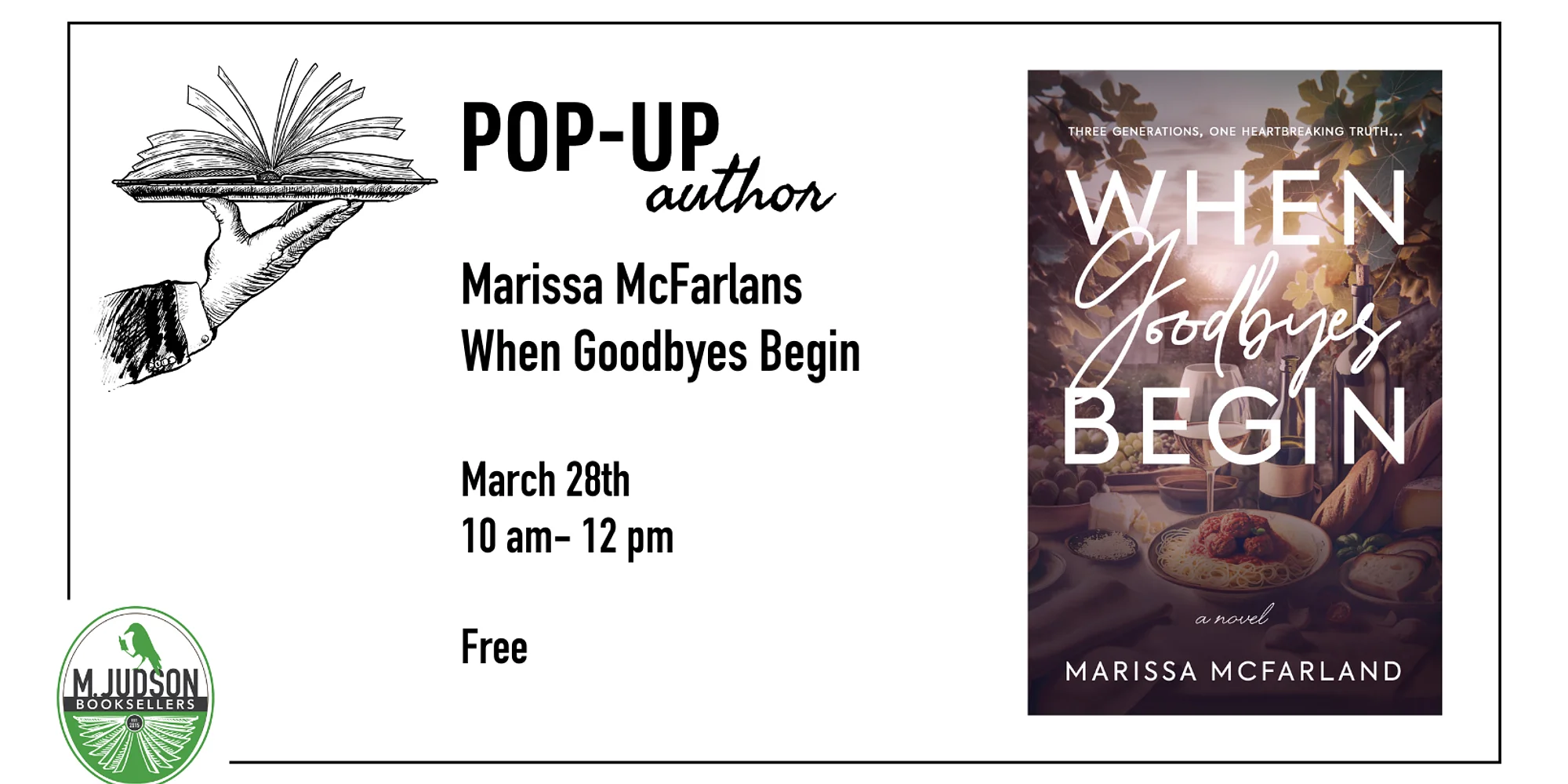Stop by M. Judson Booksellers for a free pop up event with local author Marissa McFarland and her debut novel, When Goodbyes Begin! ABOUT THE BOOK: Sometimes the life you’re meant to live comes together after everything falls apart. For years, Anna Capozzi followed the rules. She put family and career before love and dreams and never missed a Sunday dinner with her demanding Italian parents and her brother, Frank. When she shocks herself by walking off the job and away from her nursing career, Anna’s life falls apart…which sets the real Anna free to come together, as she starts her own business and meets the man of her dreams. But before she can celebrate her new life, her father’s growing forgetfulness leads to a devastating diagnosis. Once again, Anna’s dreams are put on hold to put the family first, while Frank faces a turning point in a serious relationship complicated by a hidden past. When a long-buried family secret comes to light, Anna and Frank begin to question everything they thought they knew about their parents, their roots, and themselves. Bound by love, burdened by secrets, and shaped by tradition, Anna must find the strength to let go of the life she thought she wanted and embrace the one she’s meant to live. When Goodbyes Begin is a heartfelt, multi-generational story about identity, sacrifice, and coming home. ABOUT THE AUTHOR: Marissa McFarland (neé Campanella) is the author of When Goodbyes Begin, her debut novel. Her short story, “New in Town,” was featured in the online magazine, Pawners Papers. Born and raised in Eastern Pennsylvania in an Italian American household, she now resides in Clemson, South Carolina with her husband and two boys.