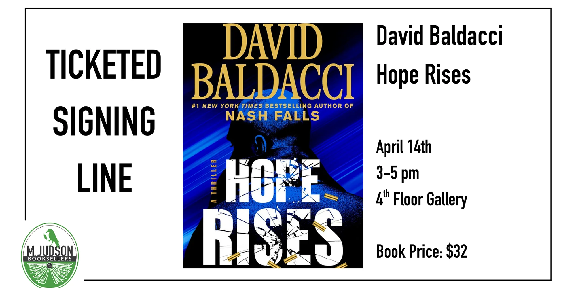 Walter Nash began a journey down a dark path of seemingly no return, and now he finds himself questioning everything that got him there in this thrilling sequel to Nash Falls from #1 New York Times bestselling author David Baldacci. Get your tickets for your spot in this signing line! ABOUT THE BOOK: Walter Nash, working under the alias of Dillon Hope, is on the road to revenge after becoming an informant for the FBI against a global criminal operation headed up by Victoria Steers. Steers has ripped everything Nash held dear away from him. He has nothing left to lose and with long, rigorous training under his belt the gentle and sensitive Nash has transformed into something he never thought he’d be: a physically imposing man with lethal skills. And now he has only goal left in life: taking down Victoria Steers. In order to succeed, he’s going to need to cross enemy lines and work the job from the inside. But Steers is shrewd and only brings those she trusts completely into her inner circle. Nash must rely on every ounce of his hard-earned skills in order to prove himself an ally to Steers if he’s ever going to get close enough to decimate her criminal empire. Yet, despite hating the woman for destroying his life, Nash finds himself oddly drawn to Steers in ways that he never could’ve imagined. And what he ultimately discovers will turn all he believed upside down, forcing Nash to do something truly unfathomable. So, will the truth set Nash free? Or end him? ABOUT THE AUTHOR: David Baldacci is an award-winning global #1 bestselling author, and one of the world’s favorite storytellers. His books are published in over forty-five languages and in more than eighty countries, with over 200 million copies sold worldwide. His works have been adapted for both feature film and television. David Baldacci is also the cofounder, along with his wife, of the Wish You Well Foundation, a nonprofit organization dedicated to supporting literacy efforts across America. Never been to a signing line?Your ticket includes entry to the event during your selected time slot, a signed copy of the book, and a chance for pictures with the author.