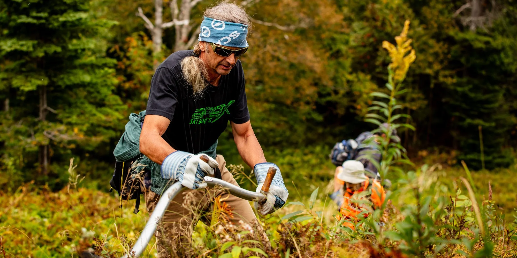 Mow some grass, earn your pass! Mow crew is the best way to get an intimate look at all of the nooks and crannies of Stark Mountain, burn some calories and make new ski buddies. At the end of the 10 days of work you’ll have earned some cash for your pocket and a full season’s pass for the upcoming winter. A little run down on how we mow our trails… We use hand scythes to cut the grass, ferns and shrubs on the steepest slopes here at Mad River Glen. Most of the beginner and intermediate terrain is mowed with a tractor, mow crew steps in to finish off the areas the tractor can’t go. We mow and move in a line shoulder-to-shoulder hiking up the trails as we go. It can be tough work but the camaraderie makes it so much fun! Truly, it is rewarding and at the end of the 10 days, you’ll have a full season ski pass and some cash in your pocket. Not only that but you will likely have learned something about the terrain you didn’t already know and you’ll have gained a couple of new ski buddies. The day begins at 7:00 am and we mow until about 3:00 pm with many short breaks in between. A backpack with a hydration pack is highly recommended and you should also pack yourself enough food to get you through the day. There will be water stations along the route to refill your containers and likely a ride down on the chairlift at the end of the day to ease the knees. Most people wear pants and long sleeves to fend off bugs and protect them from the sun but a few hardy folks go shorts and tees, everyone wears hiking boots – no exceptions. We will provide the scythe, a pair of work gloves, a sharpening stone/tools and water. If you’re interested in joining the mow crew this fall please send an email to ry@madriverglen.com.