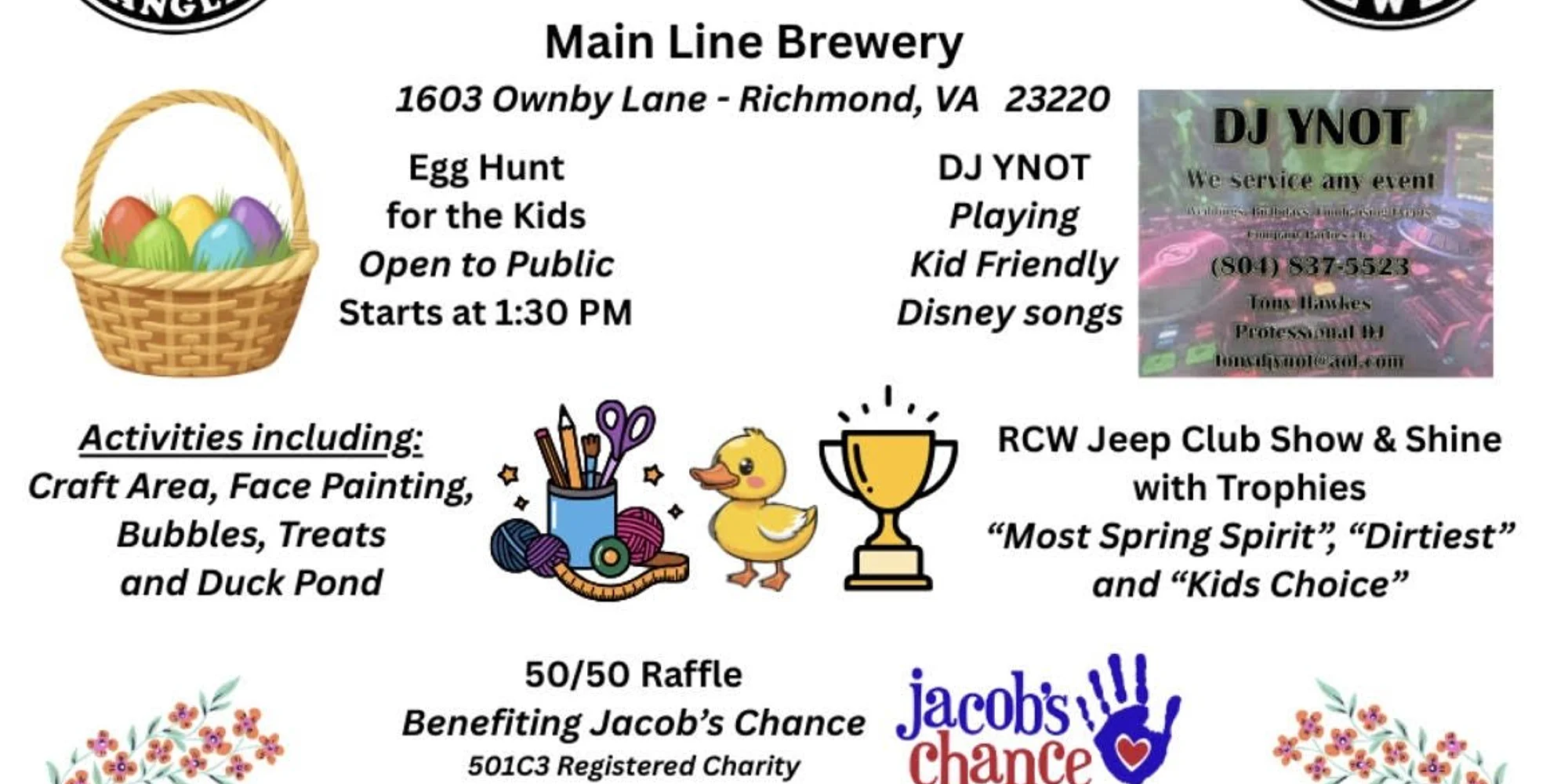 free entry- all welcome-kid friendly! - dog friendly! egg hunt for the kids-open to the public! dj ynot spinning tracks- playing kid friendly disney songs activities include: craft area, face painting, bubbles, treats, and duck pond 50/50 raffle benefiting jacob’s chance