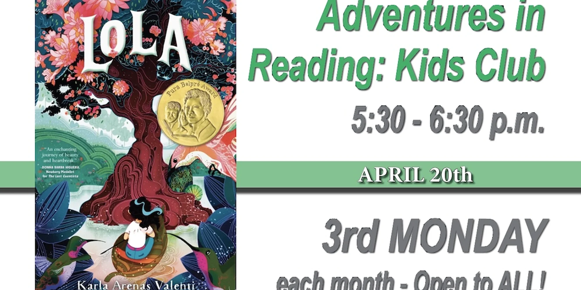 @ Our Adventures in Reading Kids Club is free and open to all AND the book is 10% off book club pricing. Come on out and join your fellow readers each month for a free pizza party and chat about the selected book. This month we’re chatting about Lola by Karla Arenas Valenti ($17.99) Book club price: 16.19 Hardcover, 272 pp Ten-year-old Lola has always lived with magic—enchanted flowers that shift with the seasons, a sandbox that coughs up strange treasures, and playful chaneques only she can see in her Mexico City home. But ever since The Thing That Happened, her brother Alex has grown mysteriously ill, and the great tree at the center of their house has begun to wither along with him. Convinced the two are connected, Lola seeks answers from a grocery-store oracle and follows the chaneques into Floresta, a hidden realm of wonders, monsters, and ancient myth. There, a young queen guards the secret Lola needs to save Alex. To bring her brother home, Lola must summon courage she never knew she had. A heartfelt, magical-realist adventure celebrating family, bravery, and the power of love. Add to calendar Google Calendar iCalendar Outlook 365 Outlook Live
