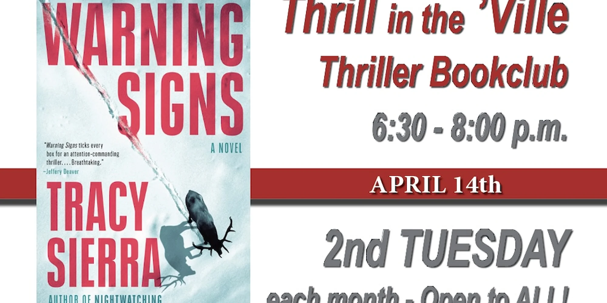 @ Come join the Thrill in the ‘Ville thriller book club discussion – wine and apps are free, and as always, our clubs are free and open to all, PLUS the book club picks are offered at the 10% off book club discount. This month we’re chatting about: Warning Signs by Tracy Sierra ($30.00) Book club price: $27.00 Hardcover, 368 pp Twelve-year-old Zach, schooled in mountain survival by his late mother, is eager to prove himself during a father-son backcountry ski weekend arranged by his cash-strapped father Bram. Surrounded by adults who dismiss icy conditions and push boundaries with bravado, Zach keeps a wary eye on the landscape — and on the men. When strange tracks begin appearing in the snow, he senses there’s more danger than weather. As the wilderness closes in, Zach must now rely on his instincts, confronting not only the unknown terror lurking in the forest, but also the darker instincts of those he’s supposed to trust. This is a chilling, atmospheric thriller that merges survival horror with fragile family ties, and keeps you turning pages long after lights are out. Ripe with discussion possibilities! Add to calendar Google Calendar iCalendar Outlook 365 Outlook Live