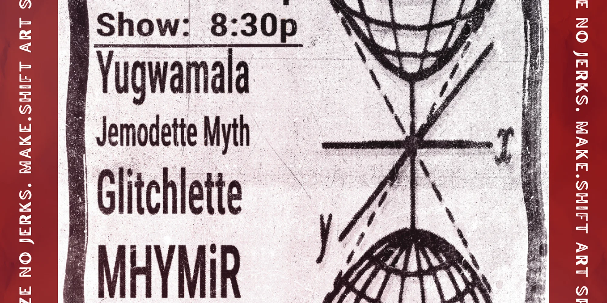 Buy Now MHYMiR Glitchlette Jemodette Myth Yugwamala Doors @ 8pm Show @ 8:30pm $11 pre sale $15 at door CASH ONLY Make.Shift Art Space 306 Flora Bellingham WA 98225 NO BOOZE // NO DRUGS // NO JERKS