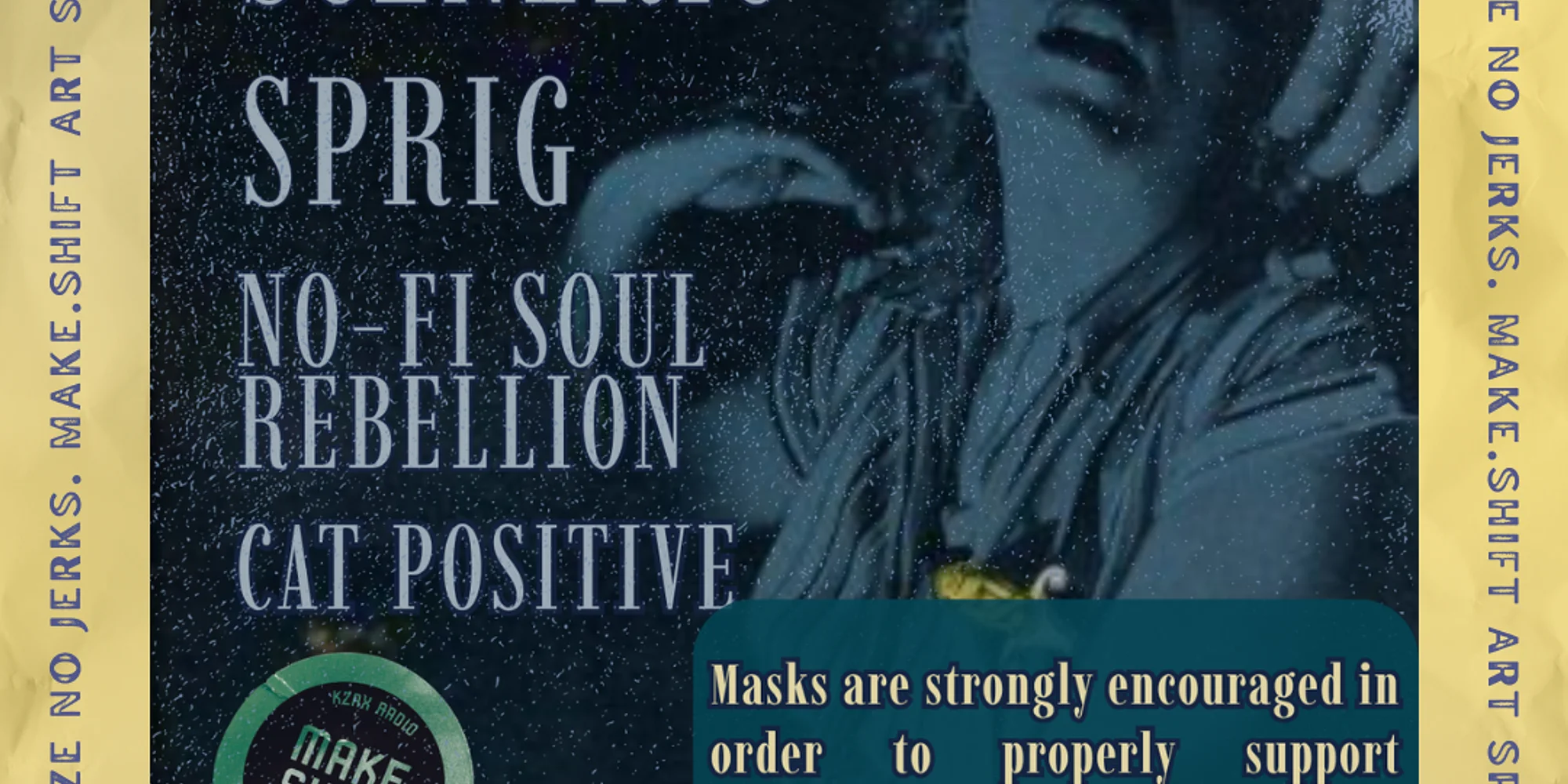 Buy Now Sceneric Sprig No-Fi Soul Rebellion Cat Positive Doors @ 8pm Show @ 8:30pm $11 pre sale $15 at door CASH ONLY Make.Shift Art Space 306 Flora Bellingham WA 98225 NO BOOZE // NO DRUGS // NO JERKS