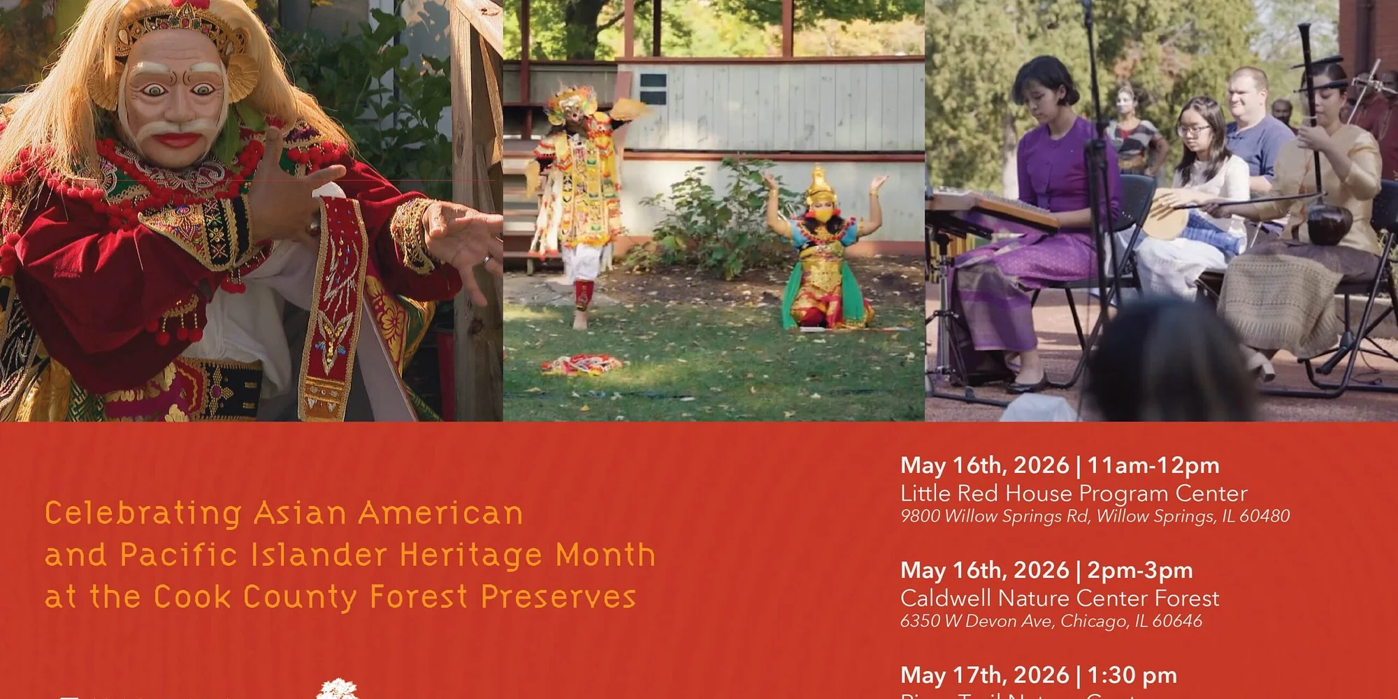 In honor of Asian Heritage Month, Pan-Asian artists gather across three Cook County Forest Preserves to bring cultural memories of nature to life. Through live interviews collected by Mandala team, musicians, dancers, and narrators transform these stories into a vibrant, immersive performance experience. Set within the natural beauty of the forest preserves, audiences will journey through Asian dance, music, and storytelling that reflect deep cultural connections to land, memory, and community. This unique event invites participants to experience the forest through the sounds, movements, and voices of diverse Asian traditions. Artists Include: Chethan Anant, Tzu-Tsen Wu, Bob Garrett, Tatsu Aoki, Saraswathi Nanganathan, Pak Ngurah Ensemble, and more! May 16th, 2026, 11am-12pm Little Red House Program Center 9800 Willow Springs Rd, Willow Springs, IL 60480 May 16th, 2026 2pm-3pm Caldwell Nature Center Forest 6350 W Devon Ave, Chicago, IL 60646 May 17th, 2026 1:30 pm Asian American Heritage Month Performance 3120 Milwaukee Ave, Northbrook, IL 60062 Artist Lineup & Bios: Chethan Anant: Chicago-based Indian classical musician, multi-instrumentalist, and educator blending Hindustani classical music with jazz, Carnatic, blues, and electronic collaborations. Founder of The Bansurist LLC. Tzu Tsen Wu: Taiwanese musician specializing in zhongruan and liuqin, also playing ukulele, guitar, piano, banjo, and jakhee. Performs internationally and teaches while pursuing a master’s in World Music at Northern Illinois University. Bob Garrett: Chicago-based musician and composer with extensive experience in theater, dance, and international music collaborations. Performed in Hamilton (Chicago), Sting’s The Last Ship, and The Lion King national tour. Co-founder of Posterchild Art. Saraswathi Ranganathan: Chicago-based Carnatic veena artist and cross-cultural collaborator. Chicago Music Award winner who has performed with Disney’s Jungle Book and received Logan Foundation support. Over three decades of performing and teaching. Tatsu Aoki: Chicago-based composer, filmmaker, educator, and performer. Founder of the Chicago Asian American Jazz Festival and Executive Director of Asian Improv aRts Midwest, advancing cross-cultural collaboration and Japanese traditional arts. Habib: Sarod musician. More information coming soon! Pak Ngurah Ensemble: Gusti Ngurah Kertayda, Lead, is a graduate of the National Performing Arts Institute (KOKAR) in Denpasar, Indonesia. He is now the director of Indonesian Dance of Illinois, a non-profit organization in the greater Chicago area promoting Indonesian culture through dance and music. This is a free event. Please Register Here!