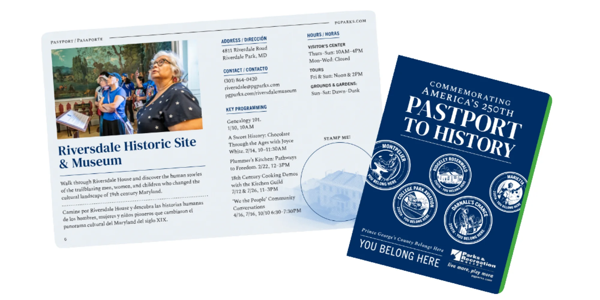 HOW DO YOU USE THIS PASTPORT? Use your Pastport to travel through time and discover the real stories of the people who built and shaped Prince George’s County. At each museum you visit, explore exhibits, programs, and tours, and discover how the past connects to your present. General admission to all museums is FREE. Visit all seven museums Collect all seven Pastport stamps Turn in your Pastport to enter a drawing for a FREE trip to any National Trust for Historic Preservation site you choose! WHAT’S THE PRIZE Enter for a chance to win one of two free trips for two to any National Trust for Historic Preservation site of your choice! Explore all the amazing destinations you could choose from at savingplaces.org. Each grand prize includes: Round-trip airfare A 3-day, 2-night stay for two in one hotel room near your selected historic site Admission to the site, coordinated by the National Trust for Historic Preservation Limit one entry per person. Entries must be submitted by December 31, 2026. The drawing will take place on January 8, 2027. For complete terms & conditions, click on the “TERMS & CONDITIONS” tab below. Museums To Visit Pastport Pickup Locations Upcoming Events Terms & Conditions Museums To Visit College Park Aviation Museum Museums Darnall’s Chance Historic Site & Museum Historical Sites Museums Marietta Historic Site & Museum Historical Sites Museums Montpelier Historic Site & Museum Historical Sites Museums Ridgeley Rosenwald School Historic Site & Museum Historical Sites Museums Riversdale Historic Site & Museum Historical Sites Museums Surratt Historic Site & Museum Historical Sites Museums Pastport Pickup Locations Location Address Belair Mansion 12207 Tulip Grove Dr, Bowie, MD 20715 Belair Stable Museum 2835 Belair Dr, Bowie, MD 20715 Beltsville Community Center 3900 Sellman Rd, Beltsville, MD 20705 Berwyn Heights Community Center 6200 Pontiac St, Berwyn Heights, MD 20740 Bladensburg Community Center 4500 57th Ave, Bladensburg, MD 20710 Bladensburg Waterfront Park 4601 Annapolis Rd, Bladensburg, MD 20710 Bowie Community Center 3209 Stonybrook Dr, Bowie, MD 20715 Bowie Railroad Museum 8614 Chestnut Ave, Bowie, MD 20715 Brentwood Arts Exchange 3901 Rhode Island Ave, Brentwood, MD 20722 Cedar Heights Community Center 1200 Glen Willow Dr, Capitol Heights, MD 20743 College Park Aviation Museum 1985 Corporal Frank Scott Dr, College Park, MD 20740 Columbia Park Community Center 1901 Kent Village Dr, Landover, MD 20785 Deerfield Community Center 13000 Laurel – Bowie Rd, Laurel, MD 20708 Evelyn Cole Senior Activity Center 5720 Addison Road, Seat Pleasant, MD 20743 Glenarden Community Center 8615 McLain Ave Suite A, Glenarden, MD 20706 Glenn Dale Community Center 11901 Glenn Dale Blvd, Glenn Dale, MD 20769 Glenridge Childcare North 7200 Gallatin St, Landover Hills, MD 20784 Good Luck Community Center 8601 Good Luck Rd, Lanham, MD 20706 Greenbelt Branch Libra...