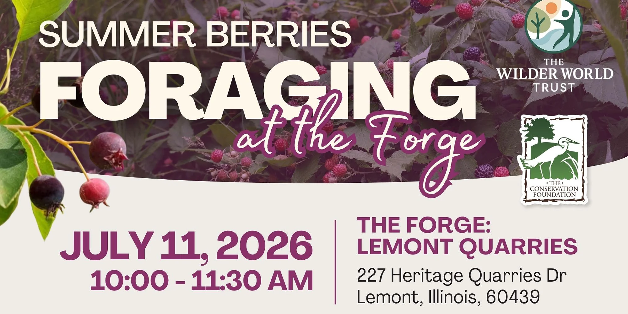 Summer Berries: Foraging at The Forge Plant Walk Saturday, July 11th 10:00 — 11:30am The Forge: Lemont Quarries 227 Heritage Quarries Dr Lemont, Illinois, 60439 Join us at our Summer Berries: Foraging at The Forge Plant Walk where Eric Izzo of The Conservation Foundation will lead a walk showing participants wild berries and other wild edible plants that are common in our local landscapes. Eric will discuss plant identification, which parts of the plants to eat and how to prepare them, safety, and foraging ethics. This event is best suited for ages 18+ or 14+ with an adult and is co-hosted by The Wilder World Trust and The Conservation Foundation.