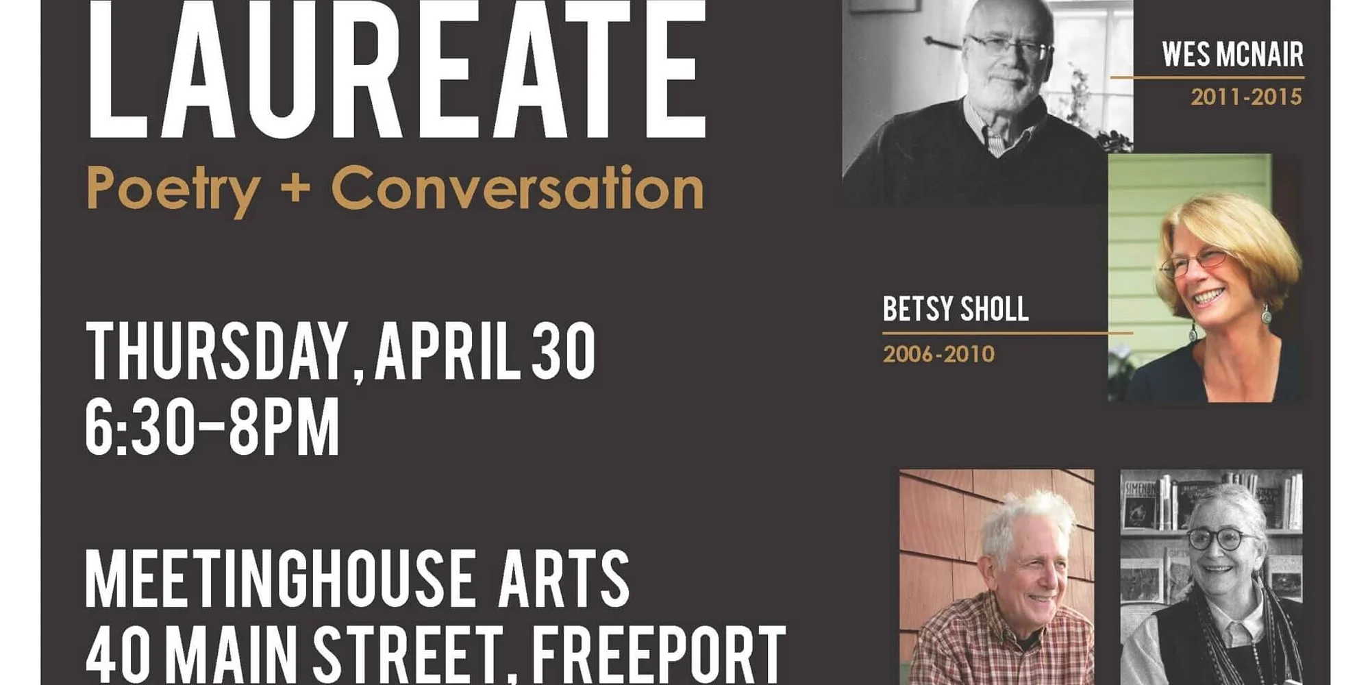 Date & Time: Thursday, April 30, 2026 | 6:30 PM Location: Meetinghouse Arts, 40 Main St, Freeport Join us for this State of Maine National Poetry Grand Finale Event: a never-been-done-before reading by ALL of the Maine Poets Laureate to be held in Freeport. A partnership of Maine Arts Commission, the Maine Writers and Publishers Alliance and Freeport Folio. Tickets Coming Soon. Sign up for The Circle Newsletter to be the first to know when tickets go on sale. For more information, CLICK HERE.
