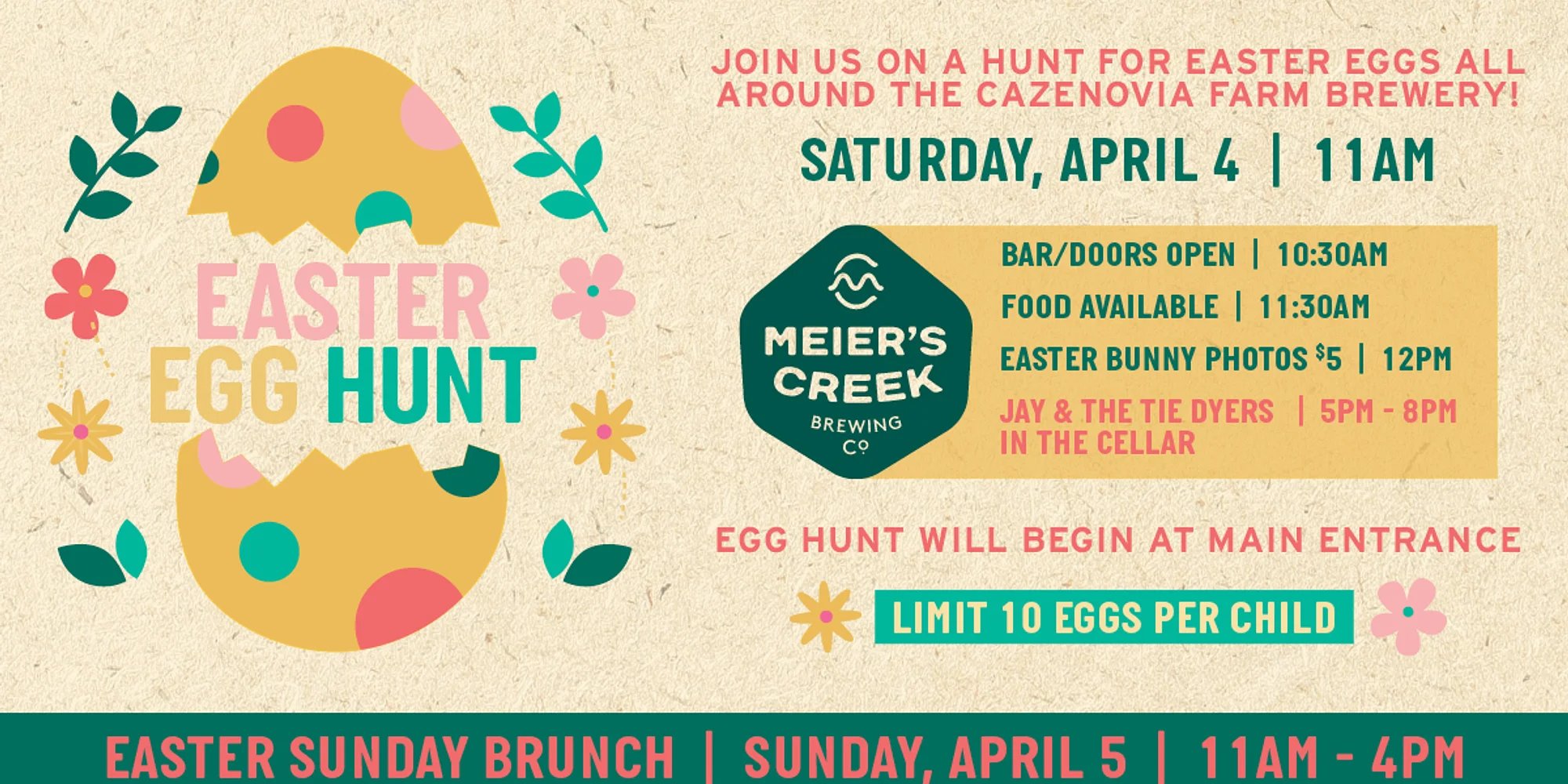 Celebrate Easter weekend with family, friends, and plenty of springtime fun at Meier’s Creek Brewing Company! 🌷🐣 Saturday – Join us at the Cazenovia Farm Brewery for our annual Easter Egg Hunt on Saturday, April 4 at 11AM. Kids can explore the grounds searching for colorful eggs hidden all around the brewery—just be sure to hop over early, because the hunt begins at the main entrance and each child can collect up to 10 eggs! It’s a festive, family-friendly morning full of excitement, laughter, and a little friendly competition. Sunday – The celebration continues on Easter Sunday, April 5 with a special Easter Brunch from 11AM–4PM, with live music 12-3pm. Bring the whole family to enjoy delicious food and great drinks! Whether you’re hunting for eggs, gathering for brunch, or just enjoying a spring day at the farm brewery, it’s the perfect way to celebrate Easter together. 🌼 Let’s hop to it! 🍻