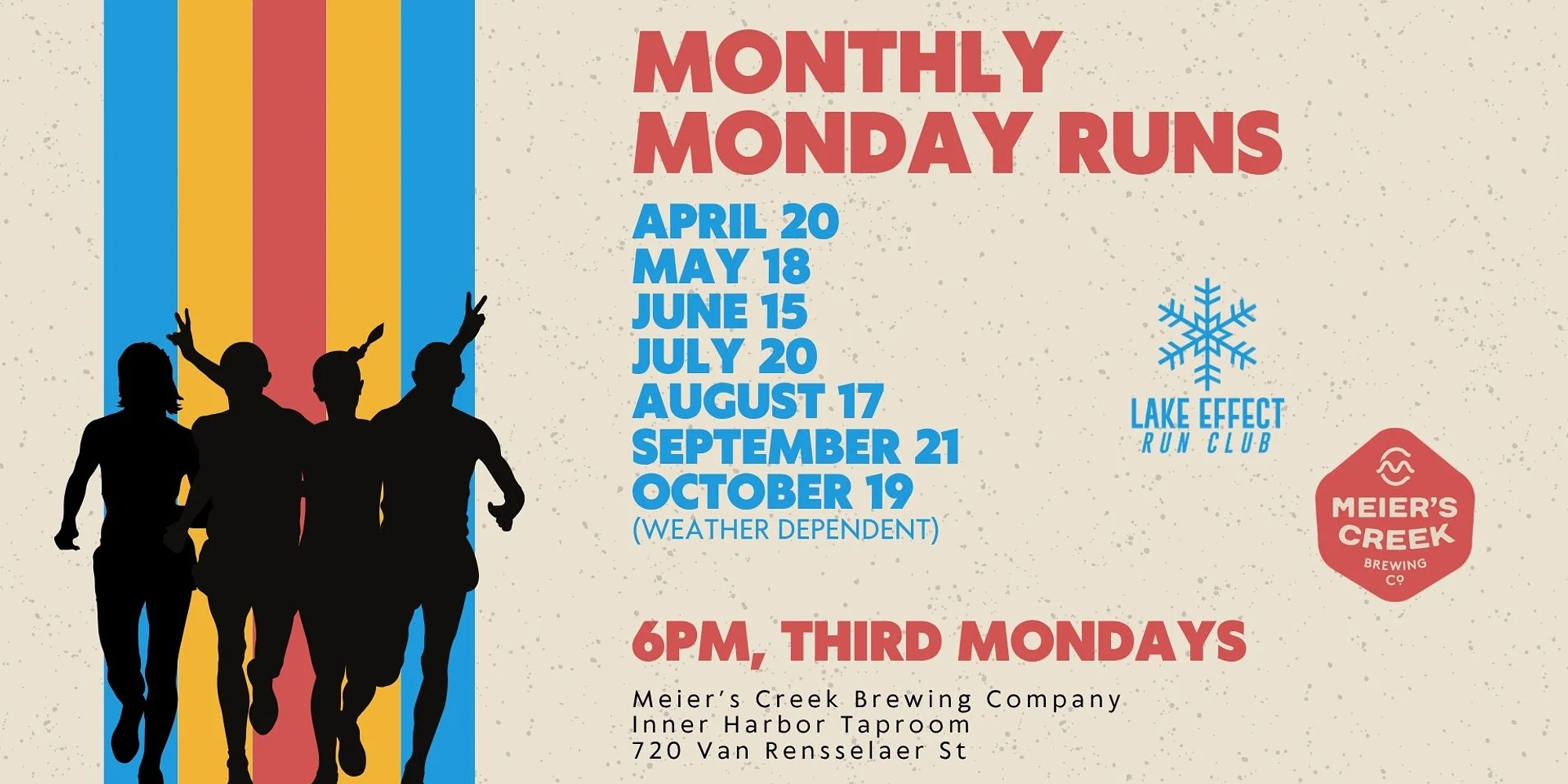 🏃♀️ Lake Effect Run Club at Meier’s Creek Brewing Co. Lace up and join the Lake Effect Run Club for monthly Monday evening runs at Meier’s Creek Brewing Company’s Inner Harbor Taproom! Whether you’re a seasoned runner or just looking for a fun, social way to stay active, this laid-back run club is all about community, movement, and good vibes. Runs take place on the third Monday of every month (weather dependent) and are followed by the perfect post-run reward—great beer and even better company at Meier’s Creek. Details: 🕕 Time: 6:00 PM 📍 Location: Meier’s Creek Brewing Company – Inner Harbor Taproom 720 Van Rensselaer St, Syracuse, NY 🌦️ Weather dependent: Keep an eye on Lake Effect’s social media for updates. All paces are welcome. Just bring your running shoes and a positive attitude—we’ll take care of the rest!
