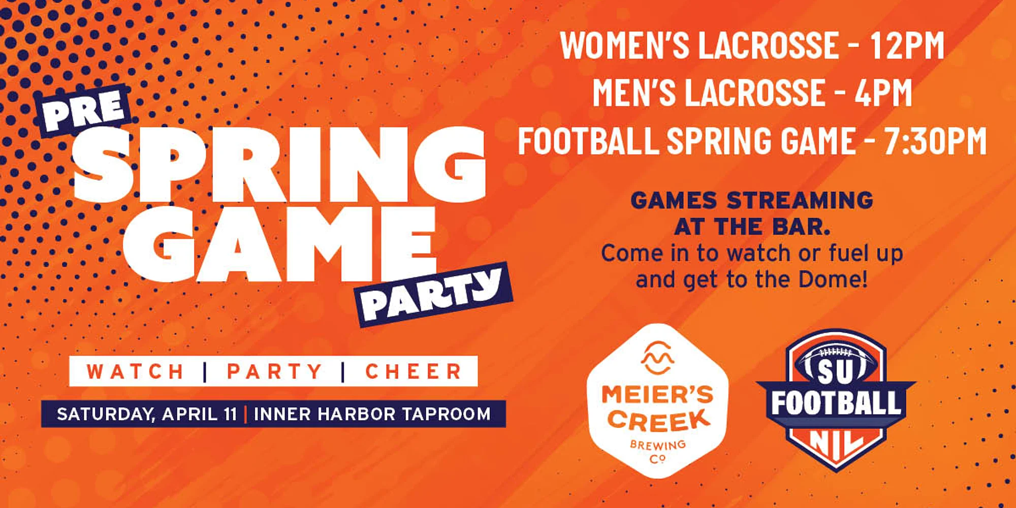 Get ready for a full day of Orange pride—this is your ultimate pregame destination. Join us at the Inner Harbor Taproom on Saturday, April 11 for a high-energy watch party leading up to the big night. We’re streaming every moment, from women’s lacrosse at noon to men’s lacrosse at 4PM, all building toward the main event—the Football Spring Game at 7:30PM. Whether you’re settling in to catch every play or stopping by to fuel up before heading to the Dome, this is where the excitement starts. Expect a lively crowd, great beer, and wall-to-wall action as we watch, party, and cheer together. Make it a day. Bring your crew. Let’s get loud. Go ‘Cuse!