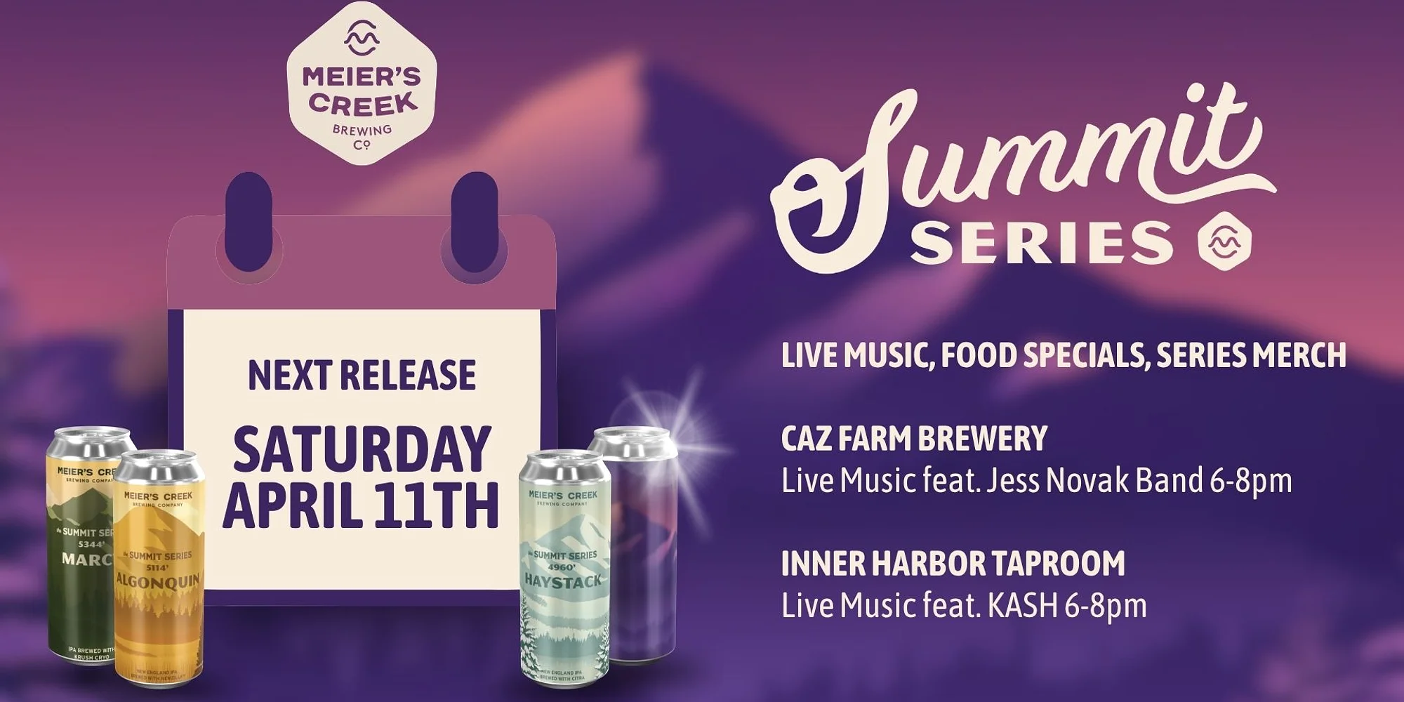 The next Summit is on the horizon. Join us Saturday, April 11th as we unveil the latest release in our Summit Series—an ongoing exploration of bold ideas, elevated flavors, and the spirit of the climb. Celebrate the occasion at both taprooms with an evening designed to match the moment. Enjoy live music, thoughtfully crafted food specials, and exclusive Summit Series merchandise as you take in the atmosphere and raise a glass to the next ascent. At Caz Farm Brewery, the Jess Novak Band sets the tone in The Cellar 6-8pm. Food specials include Spicy Thai shrimp and lo mein, Hawaiian Pizza, and Jerk Wings. The Inner Harbor Taproom features live music from KASH 6-8pm. Highlighting our next Summit Series Pizza. Two locations. One release. Another step higher. Brewed for the Summit. Savored at the bar.