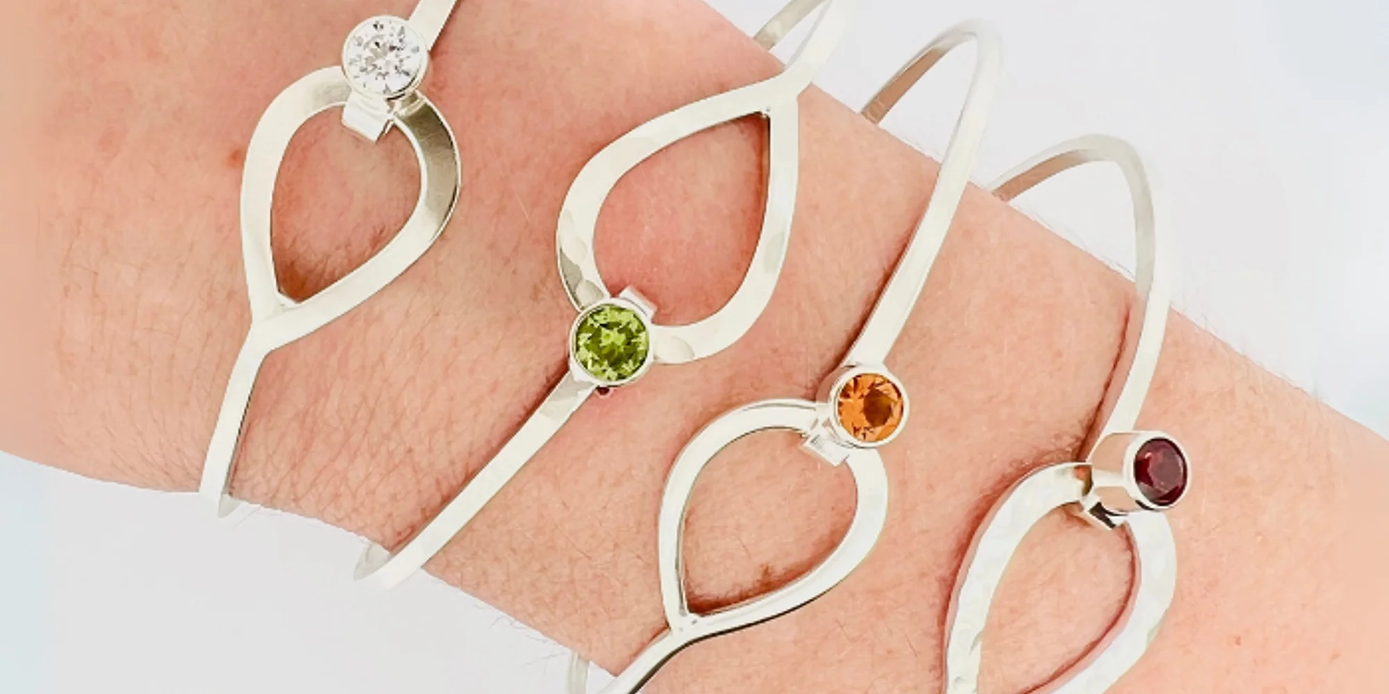 Price $215.00 SATURDAY, May 16, 2026 10:00am-3:00pm (includes 30 minute lunch break) Come join us for this exciting class, where you’ll learn how to forge your very own bangle bracelet with a tube set gemstone and tension locking mechanism. This class is perfect for those who already have some silversmithing/jewelry making experience and want to continue learning more techniques while making a fun piece, however all skill levels are welcome! Students will learn the following in this class: Basic Forging and Forming Techniques Soldering Techniques Tube Setting a Round Faceted Gemstone Basic Finishing & Polishing Materials for one sterling silver and gemstone bracelet are included in class fee. Students can choose from the following gemstones: Amethyst Blue Topaz Citrine Garnet Peridot White CZ