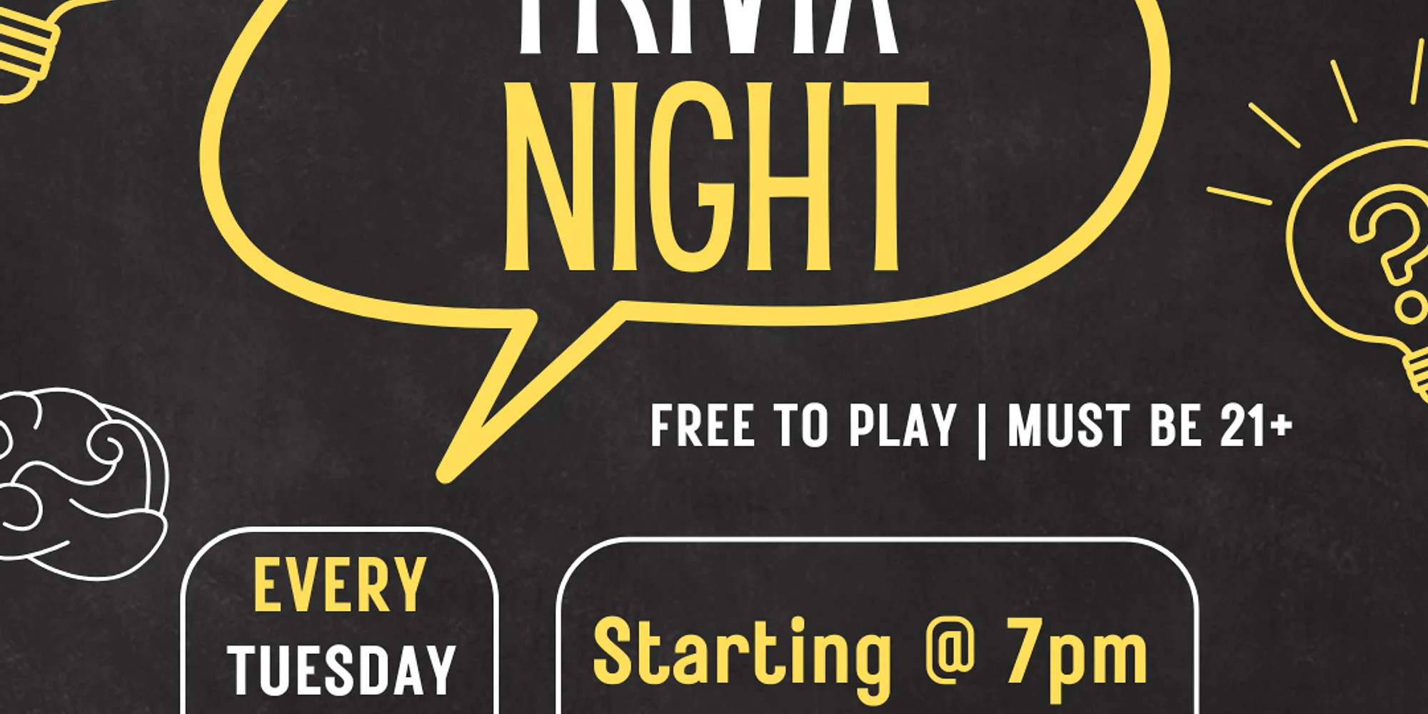 Get your team together and join us every Tuesday - now starting at 7pm in the pub! FREE TO PLAY! Prizes for the Top 3 teams! Reservations no longer needed! Tables are first come, first serve