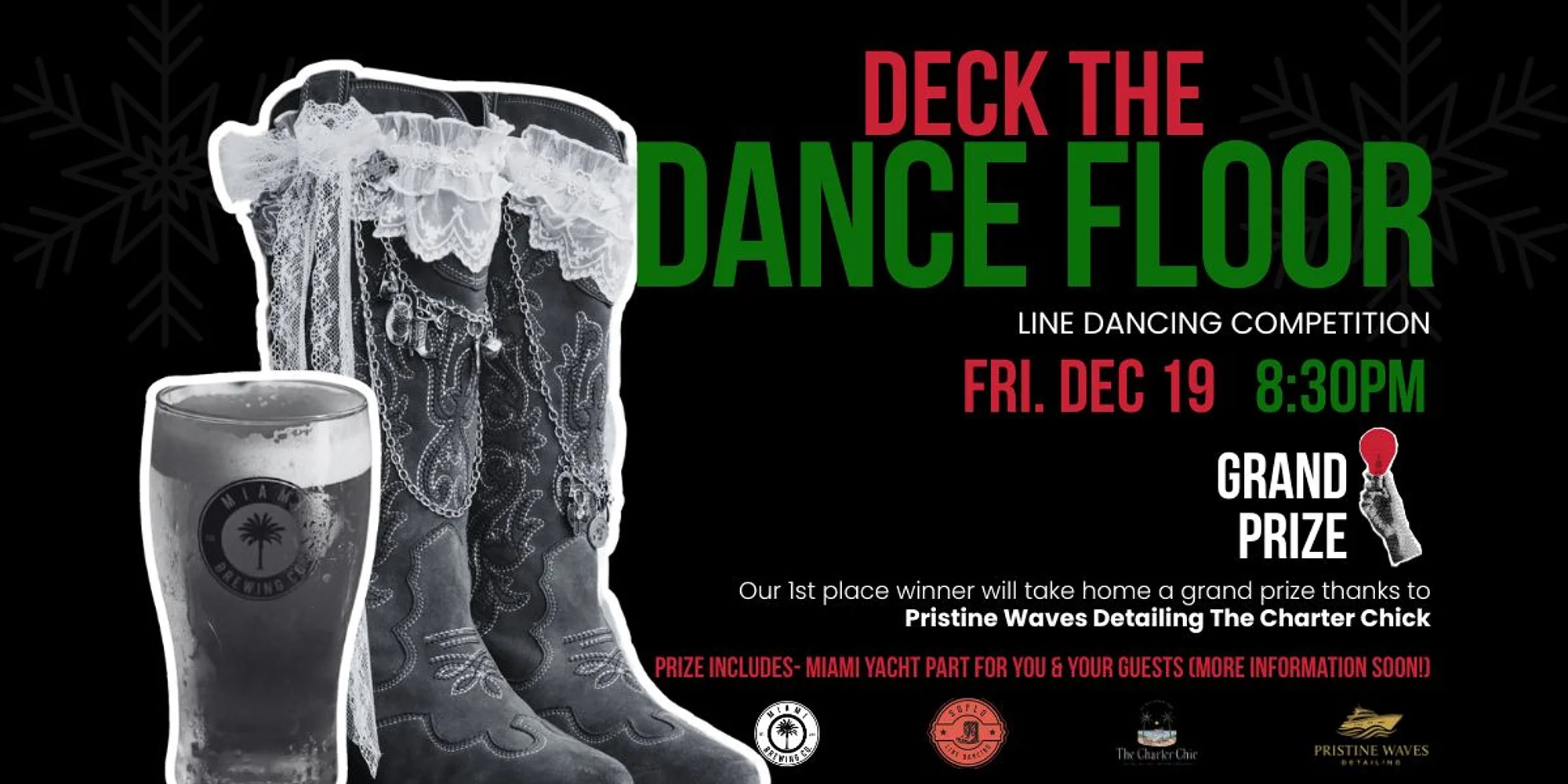 Join us on Friday, December 19 at 8:00 p.m. for Deck the Dance Floor, Miami Brewing Company’s festive Line Dancing Competition. This special holiday edition brings together the best of country music, seasonal energy, and friendly competition — all inside the brewery’s iconic taproom. Dancers of all styles and skill levels are welcome to compete for this year’s Grand Prize, generously provided by Pristine Waves Detailing and The Charter Chick: a private Miami Yacht Party for the winner and their guests. (More prize details will be announced soon.) Enjoy a night of music, holiday spirit, ice-cold craft beer, and lively community vibes as we celebrate the season — country-style. 📍 Miami Brewing Company 📅 Friday, December 19, 2025 🕣 Competition starts at 8:30 p.m.