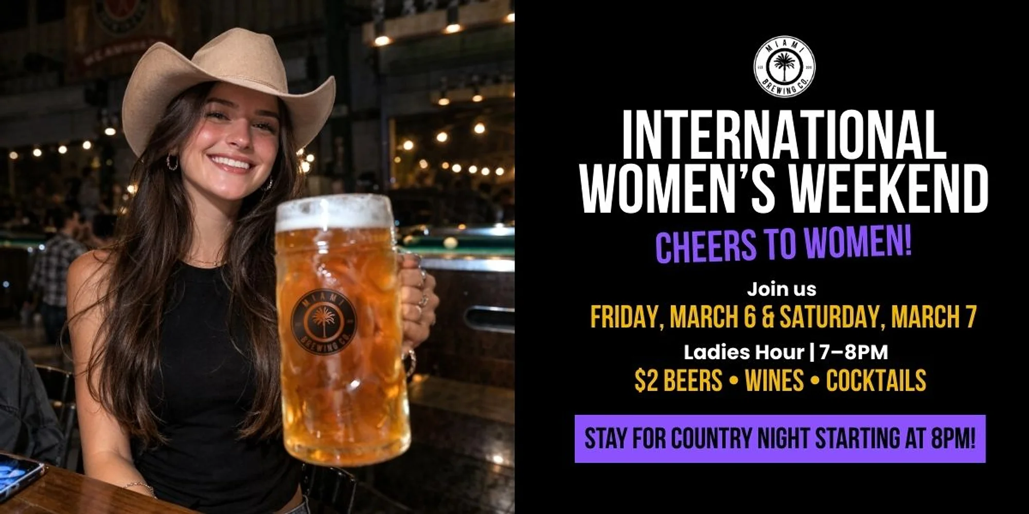 Join us at Miami Brewing Company for International Women’s Weekend, a special celebration dedicated to the women who bring the energy, the strength, and the unforgettable vibes to every weekend. 📅 Friday, March 6 & Saturday, March 7 💖 Ladies Hour | 7PM–8PM Enjoy $2 beers, wines, and cocktails. Then stay for the main event… 🤠 Country Night starts at 8PM Dance, line dance, and celebrate all night long. Bring your friends, raise a glass, and celebrate Women’s Weekend the right way — with great drinks, great music, and even better company. 🎟 Get your Country Night tickets in advance.