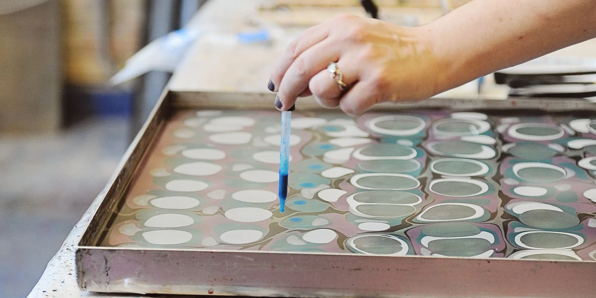 Build your marbling skills! Marbling Lab provides individuals a fully equipped marbling station. Fee covers use of 16×20 inch tanks of carrageenan, rakes, alum, brushes, cups and eye droppers; supply your own Golden Fluid Acrylic paint and paper. Experience Required Pricing $50 | $25 Scholarship | $75 Pay-It-Forward $15 materials fee MCBA members receive a 10% discount on tuition. Scholarships are available for individuals facing adversity as it relates to identity, income/wealth, and lack of access to arts resources. The Pay-It-Forward rate (tuition, plus 50%) supports MCBA’s efforts to make scholarships available. We leave it to you to choose the rate that is meaningful to you based on your income, wealth, and privilege status. Experience Required Marbling Lab is designed for those who have taken an introductory level marbling workshop, Introduction to Marbling at MCBA, or a similar workshop elsewhere. If you have questions about your experience level, please email studios@mnbookarts.org prior to registration. If you need marbling experience to register for future Marbling Labs, we invite you to register for Introduction to Marbling. Registration closes 48 hours in advance. Instructions on how to enter MCBA for Studio Lab will be sent in a confirmation email once registration is complete. Upcoming Marbling Labs Jan 3 Jan 3, 2026 Marbling Lab Jan 3, 2026 Marbling Lab provides individuals a fully equipped marbling station. Jan 3, 2026 Register