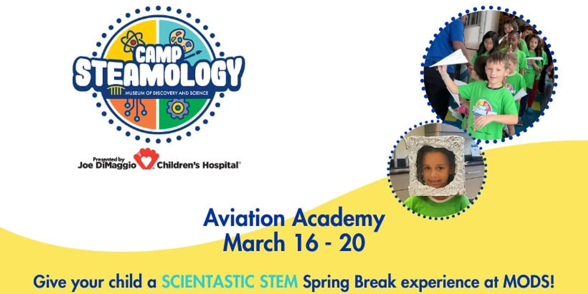 @ At Camp STEAMology, we’ve crafted the ultimate age-appropriate camp experience for campers in kindergarten through fourth grade, offering interactive exploration and hands-on learning in the coolest camp environment, including a weekly IMAX® immersion! Presented by Joe DiMaggio Children’s Hospital, this spring break adventure invites children to blast off as MODS Aviators. From soaring paper airplanes to powerful rocket launches, campers will discover the science of lift, thrust and propulsion. With hands-on experiments and creative challenges, they will explore what it takes to fly through the skies and journey beyond Earth as pilots and astronauts in training. Grades: Kindergarten through 4th grade Ages: 5-10 Time: 9:00 a.m. – 3:30 p.m. Drop off: 8:30 a.m. Register Here Museum of Discovery & Science 954-467-6637 View Organizer Website Add to calendar Google Calendar iCalendar Outlook 365 Outlook Live