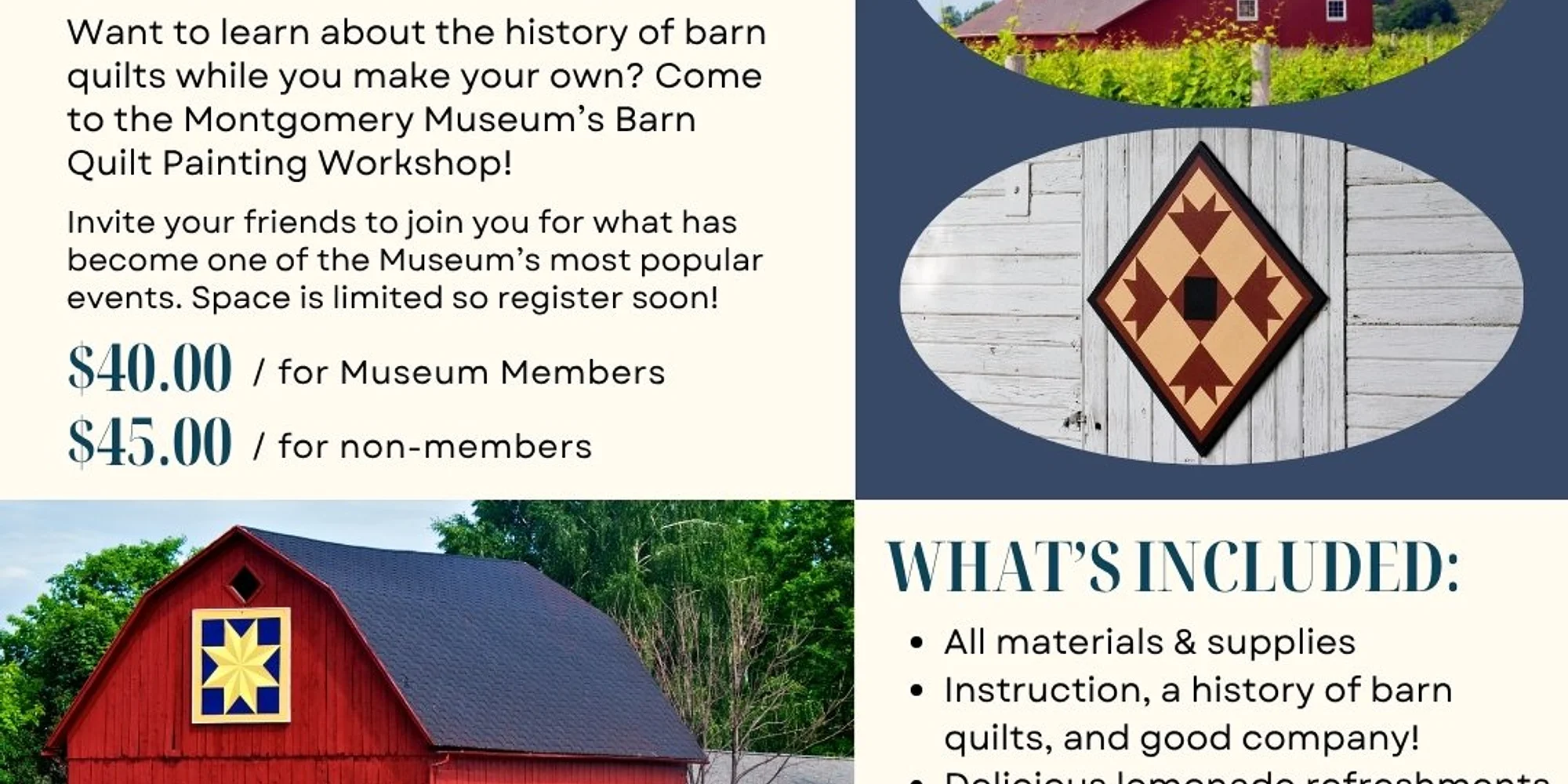 Want to make your own painted mini Barn Quilt to display? Come to the Montgomery Museum’s Barn Quilt Painting Workshop on Saturday, April 25 from 1 - 3:30pm! Invite your friends to join you for what has become one of the Museum’s most popular events. Space is limited so register soon! No prior painting or art experience is needed for this workshop - just be ready to have fun! What’s Included: All materials & supplies to make a 1’ x 1’ barn quilt on wooden board Instruction, guidance, and great company! Delicious lemonade refreshments Museum Members: $45 Non-Members: $50 To use your member discount, use code MEMBER while in checkout. Mini Barn Quilt Painting Workshop $50.00 Purchase Only 1 available