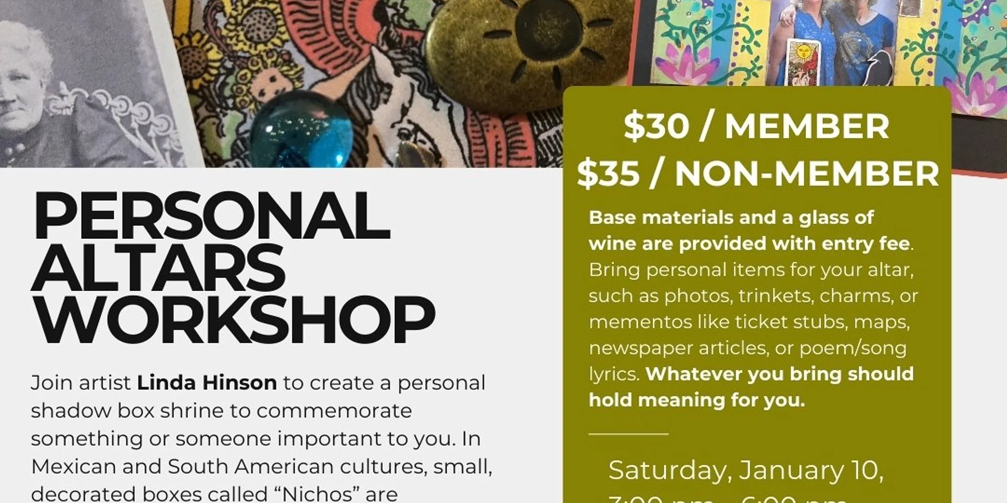 Join exhibiting artist Linda Hinson to create a personal shadow box shrine to commemorate something or someone important to you. In Mexican and South American cultures, small, decorated boxes called “Nichos” are commonly found in homes and public places, displayed on walls or pedestals. Often painted with bright colors, they provide a stage-like setting for an object or collection of objects that have great significance. Most commonly functioning as an altar for a religious icon, a Nicho can also serve as a memorial to a loved one or as a reminder of an important event What purpose will your altar/shrine/nicho have? To memorialize someone, something, or some place. To honor a special day or idea. To help with a goal or some change you want to make. To center yourself or make you feel at peace. To honor a belief. As protection or to help you face a fear. Base materials and a glass of wine will be provided with entry fee. Please also bring personal items for your shrine. Try to decide ahead of time what your shrine will honor. Then bring items and objects to represent that idea. For example: photos, trinkets, and notions like beads, junk jewelry, charms, or mementos like ticket stubs, magazine pictures, maps, newspaper articles, or poem/song lyrics. Maybe even small rocks or keys. Whatever you bring should hold meaning for you. Personal Altars Workshop with Linda Hinson $35.00 Museum Members: Use code MEMBER to get $5 off your ticket! Purchase
