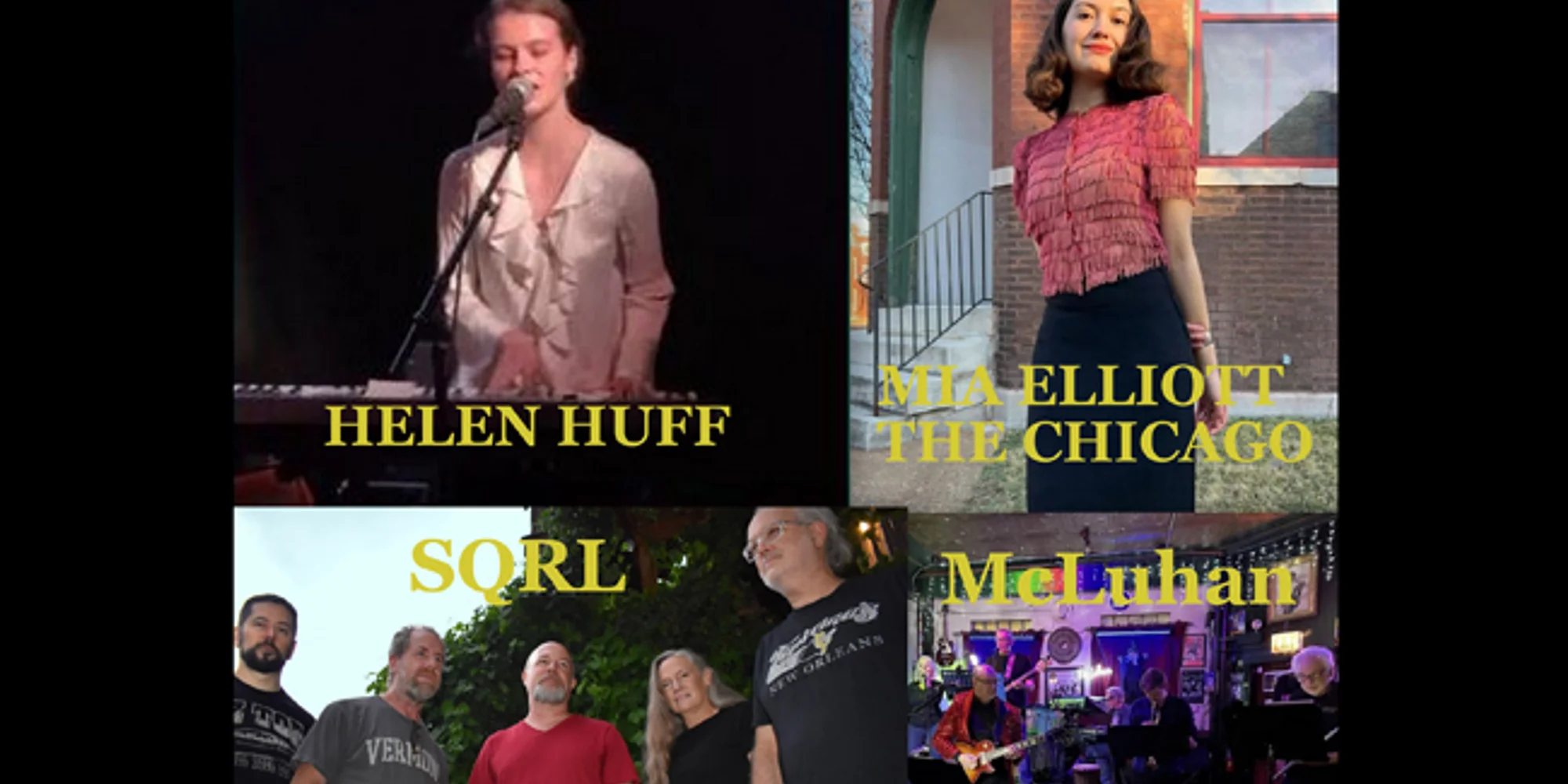 SAT. APRIL 4th – MONTROSE SALOON 📍 2933 W Montrose Ave, Chicago, IL 💵 $15 at the door 🔞 21+ w/ I.D. 🕗 Music starts at 7:30pm 7:30pm – Helen Huff is a Chicago-based jazz-trained singer-songwriter and pianist, blending expressive piano-driven songwriting with an intimate, lyrical indie sensibility https://www.instagram.com/helenhuffmusic/ https://helenhuff.bandcamp.com/ 8:30pm – McLuhan – Neal Rosner is a Chicago musician, songwriter, and founding member of the progressive rock band McLuhan, formed in 1970 by students from the University of Illinois at Chicago. The band’s 1972 debut album, McLuhan: Anomaly, found new life decades later when it resurfaced online and sparked a reunion of original members. Alongside his work with McLuhan, Rosner has also released solo albums including Kentucky and Love Isn’t the Answer, continuing a long creative journey rooted in experimental, thoughtful songwriting. https://www.facebook.com/mcluhanband 9:30pm – SQRL is an eclectic rock band that seamlessly blends diverse influences from folk to punk. Their multi-genre sound captures the essence of raw energy and relatable storytelling. https://www.facebook.com/SQRL.ROCK/ 10:30pm – The Chicagoans – The Chicagoans (fronted by Chicago vocalist Mia Elliott) are a vintage jazz band dedicated to bringing the sounds of the 1920s and 1930s back to life—mixing rare gems from the era with beloved classics. The group is known for an authentically old-school approach inspired by early jazz vocal icons (including Ruth Etting and Annette Hanshaw), delivered with “hot solos, sweet melodies, and authentic Chicago spirit.” https://www.youtube.com/@MiaElliottChicago
