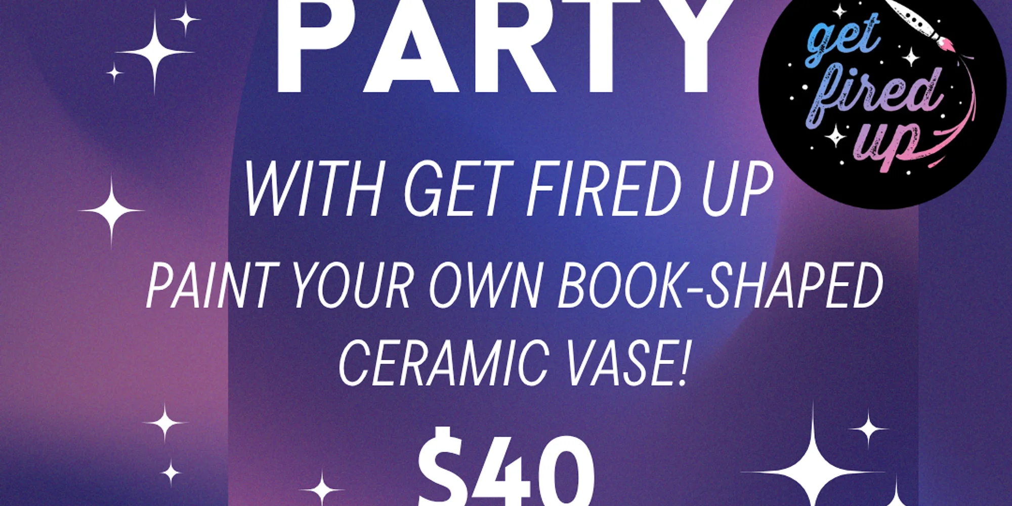We're teaming up with Get Fired Up, a paint-your-own-pottery studio in Downtown Melbourne, to bring you a book vase painting workshop at the bookstore! These book-shaped ceramic vases start out white, but by painting them with glazes, you can transform them into anything you choose! Get Fired Up will take your vases, fire them, and have them available for pickup a week later. As a bonus, you can select a book cover for them to stencil onto your vase beforehand for no extra cost! If you have a specific book in mind, enter it in the box below. We'll do our best to fulfill each request, but we can't guarantee, especially if you're purchasing your ticket within a week of the event. If you DON'T want a stencil, just put "none" or "N/A" in the box and your vase will be left blank! This workshop is $40 and includes the cost of the vase, glazes, firing, all additional supplies, and instruction by a Get Fired Up staff member. View the event waiver here! Get Tickets!