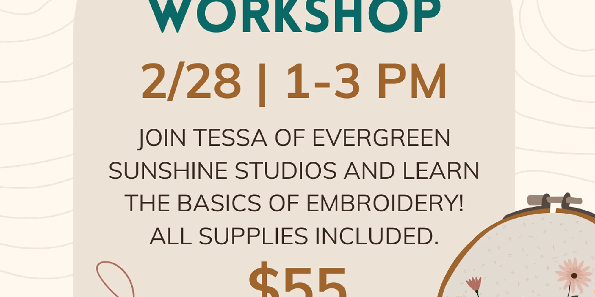 Join us on 2/28 for an embroidery workshop! Tessa of Evergreen Sunshine Studios will help you discover the art of embroidery! All supplies are included. View the event waiver here! Embroidery Workshop $55.00 Sign up now!