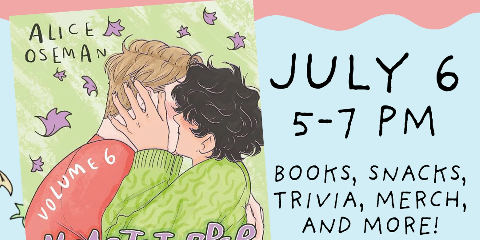 Join us to celebrate the release of the sixth and final Heartstopper volume! Discover the ending of Nick and Charlie's stories, and enjoy a themed party for fans of the series! Your ticket includes your copy and entrance to the party. At the party, you can expect: Trivia with prizes Heartstopper coloring pages (no one's too old! Plus, we'll have the official coloring book for sale!) Cupcakes and snacks Heartstopper merch for sale The books are for ages 14+, so the party is too! Note: If shipping is delayed, the party will still be held, and books will be distributed ASAP once they arrive. View the event waiver here! Sign up now!