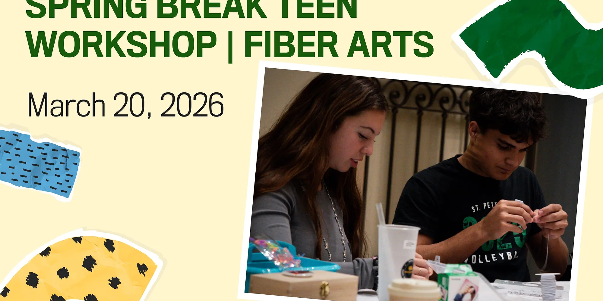 The Museum of Fine Arts St. Petersburg is hosting its first-ever week of Spring Break Teen Workshops! Students from ages 13-17 are invited to join us for immersive days of learning, creativity, and hands-on artmaking. Teens can register for a single day or mix and match sessions throughout the week. Purchase the full-week package for a discount! Explore the creative world of natural and synthetic fibers, from patterned fabrics to textured threads, and learn how to transform them into original works of art. Teens will experiment with fashion design, embroidery, weaving, and more. Bonus! All participants will leave this workshop with their own sewing kit to continue creating at home. Spring Break Teen Workshop | Fiber Arts Friday, March 20, 2026 9:00 AM–3:45 PM Museum of Fine Arts, St. Petersburg 255 Beach Drive NE, St. Petersburg FL 33701 Members – $50, Not-Yet Members – $60 GET TICKETS Check out the full Spring Break Teen Workshop schedule here and plan your week. Pre-registration is required to prepare for a successful workshop. Walk-up participants will not be accepted. Not yet a member? Become a member today and enjoy all the benefits membership at the MFA offers! MFA Members enjoy free admission for an entire year, early access to special exhibitions, discounts at the MFA Shop and Café Clementine, special member-only exclusive events, and more. Bring the whole family! BECOME A MEMBER Workshop Dates & Time March 16–20, 2026 9:00 AM–3:45 PM daily Spots are limited—register early to secure your place! Spring Break Teen Workshop Package March 16–20, 2026 Can’t choose just one workshop? The Spring Break Teen Workshop Package includes all five days at a discounted rate! Participants will paint, collage, print, sew, and explore art history spanning 5,000 years. Pricing: Members: $200 Not-Yet Members: $275 Purchase the package here. Daily Workshop Themes Monday, March 16: Paint! Tuesday, March 17: Collage & Mixed Media Wednesday, March 18: Print! Thursday, March 19: Art & Archaeology Friday, March 20: Fiber Arts Daily Workshop Schedule 8:45–9:00 AM: Drop-off 9:00 AM–12:00 PM: In-Gallery Docent Tour & Art Projects 12:00–12:45 PM: Lunch Break* 12:45–3:45 PM: Main Art Project & Artist Statements 3:45–4:00 PM: Pick-up *Teens are not permitted to leave the Museum of Fine Arts (MFA) campus at any time during the day, including lunch. Participants may bring lunch from home or purchase food and drinks from Café Clementine inside the MFA Conservatory. Note: Café Clementine is closed on Mondays—students attending Monday workshops must bring their own lunch. Teens are encouraged to bring a reusable water bottle each day. Parking Paid self-parking is available on a first-come, first-served basis in the south parking lot and along Bayshore Drive. Parking meters accept cash, credit cards, or the ParkMobile app. Additional parking garages are located within walking distance of the museum. Fees may vary and are not monitore...