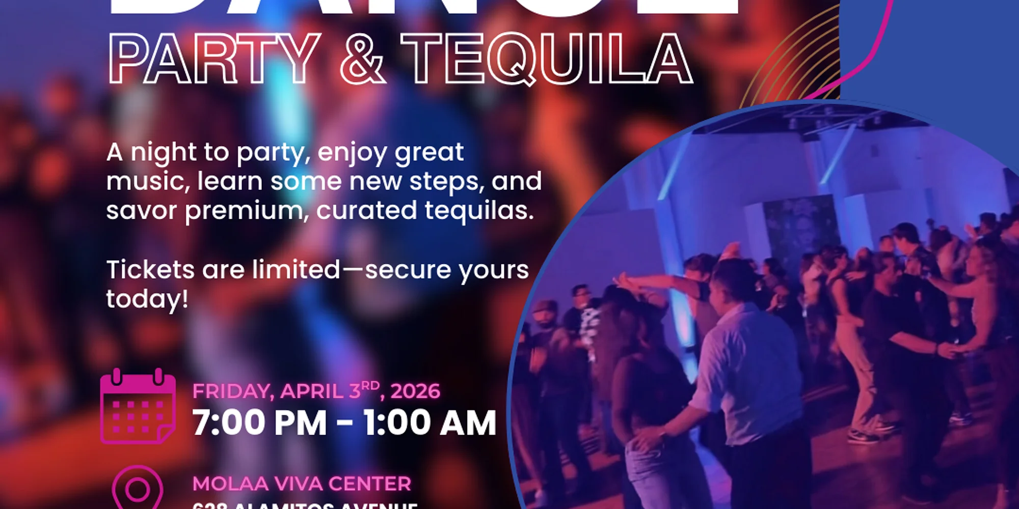 Turn up the rhythm and raise a glass at MOLAA’s Tequila Tasting & Dancing Night on April 3rd! Experience an unforgettable evening where culture, flavor, and connection come together. Savor a curated selection of premium tequilas, spark new connections during speed dating, and learn the moves of salsa and bachata with guided instruction. Then hit the dance floor and celebrate into the night. Tickets here From 7 PM to 12 AM, MOLAA transforms into Long Beach’s most vibrant destination—where art, music, and community meet. Tickets are limited—secure yours today and don’t miss this one-of-a-kind night at MOLAA. Singles Mixers – 7:00 PM We will host two organized singles mixers: • Ages 24–34 • Ages 35–45 These mixers are designed to be interactive, fun, and to help guests connect in a relaxed environment. Limited space available. Bachata Class Time – 8:30 PM For this event, the Bachata class will start at 8:30 PM. • 1-hour Bachata class led by a professional instructor • Open to singles, couples, and beginners • Designed to be welcoming, easy to follow, and fun for all levels Dance Performance We will provide professional dancers to perform, adding a showcase element to the evening. Social Dancing – 9:30 PM to 12:00 AM • DJ playing a mix of Bachata, Salsa, and Latin music • Open social dancing for all guests Presale tickets will close April 3rd at 1 p.m. PT At door prices: All Inclusive: $40 Regular: $30 *After 10 p.m., the tickets are $15* Dance Instructors from:
